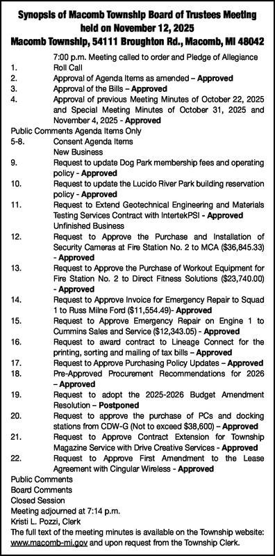 Synopsis of Macomb Township Board of Trustees Meeting held on November 12, 2025 Macomb Township, 54111 Broughton Rd., Macomb, MI 48042 7:00 p.m. Meeting called to order and Pledge of Allegiance 1. Roll Call 2. Approval of Agenda Items as amended – Approved 3. Approval of the Bills – Approved 4. Approval of previous Meeting Minutes of October 22, 2025 and Special Meeting Minutes of October 31, 2025 and November 4, 2025 - Approved Public Comments Agenda Items Only 5-8. Consent Agenda Items New Business 9. Request to update Dog Park membership fees and operating policy - Approved 10. Request to update the Lucido River Park building reservation policy - Approved 11. Request to Extend Geotechnical Engineering and Materials Testing Services Contract with IntertekPSI - Approved Unfinished Business 12. Request to Approve the Purchase and Installation of Security Cameras at Fire Station No. 2 to MCA ($36,845.33) - Approved 13. Request to Approve the Purchase of Workout Equipment for Fire Station No. 2 to Direct Fitness Solutions ($23,740.00) - Approved 14. Request to Approve Invoice for Emergency Repair to Squad 1 to Russ Milne Ford ($11,554.49)- Approved 15. Request to Approve Emergency Repair on Engine 1 to Cummins Sales and Service ($12,343.05) - Approved 16. Request to award contract to Lineage Connect for the printing, sorting and mailing of tax bills – Approved 17. Request to Approve Purchasing Policy Updates – Approved 18. Pre-Approved Procurement Recommendations for 2026 – Approved 19. Request to adopt the 2025-2026 Budget Amendment Resolution – Postponed 20. Request to approve the purchase of PCs and docking stations from CDW-G (Not to exceed $38,600) – Approved 21. Request to Approve Contract Extension for Township Magazine Service with Drive Creative Services - Approved 22. Request to Approve First Amendment to the Lease Agreement with Cingular Wireless - Approved Public Comments Board Comments Closed Session Meeting adjourned at 7:14 p.m. Kristi L. Pozzi, Clerk The full text of the meeting minutes is available on the Township website: www.macomb-mi.gov