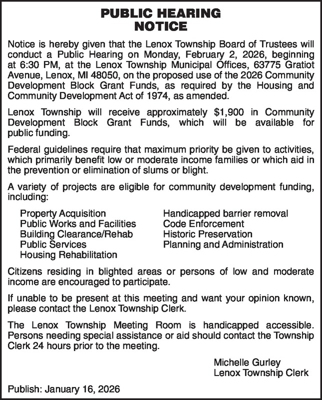 PUBLIC HEARING NOTICE Notice is hereby given that the Lenox Township Board of Trustees will conduct a Public Hearing on Monday, February 2, 2026, beginning at 6:30 PM, at the Lenox Township Municipal Offices, 63775 Gratiot Avenue, Lenox, MI 48050, on the proposed use of the 2026 Community Development Block Grant Funds, as required by the Housing and Community Development Act of 1974, as amended. Lenox Township will receive approximately $1,900 in Community Development Block Grant Funds, which will be available for public funding. Federal guidelines require that maximum priority be given to activities, which primarily benefit low or moderate income families or which aid in the prevention or elimination of slums or blight. A variety of projects are eligible for community development funding, including: Property Acquisition Handicapped barrier removal Public Works and Facilities Code Enforcement Building Clearance/Rehab Historic Preservation Public Services Planning and Administration Housing Rehabilitation Citizens residing in blighted areas or persons of low and moderate income are encouraged to participate. If unable to be present at this meeting and want your opinion known, please contact the Lenox Township Clerk. The Lenox Township Meeting Room is handicapped accessible. Persons needing special assistance or aid should contact the Township Clerk 24 hours prior to the meeting. Michelle Gurley Lenox Township Clerk Publish: January 16,
