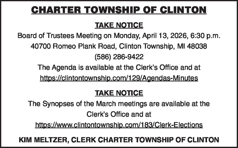 CHARTER TOWNSHIP OF CLINTON TAKE NOTICE Board of Trustees Meeting on Monday, April 13, 2026, 6:30 p.m. 40700 Romeo Plank Road, Clinton Township, MI 48038 (586) 286-9422 The Agenda is available at the Clerk’s Office and at https://clintontownship.com/129/Agendas-Minutes TAKE NOTICE The Synopses of the March meetings are available at the Clerk’s Office and at https://www.clintontownship.com/183/Clerk-Elections KIM MELTZER, CLERK CHARTER TOWNSHIP OF CLINTON