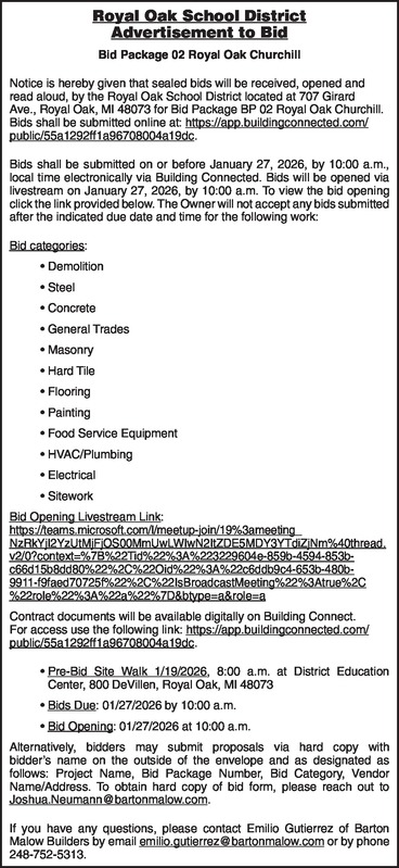 Royal Oak School District Advertisement to Bid Bid Package 02 Royal Oak Churchill Notice is hereby given that sealed bids will be received, opened and read aloud, by the Royal Oak School District located at 707 Girard Ave., Royal Oak, MI 48073 for Bid Package BP 02 Royal Oak Churchill. Bids shall be submitted online at: https://app.buildingconnected.com/public/55a1292ff1a96708004a19dc. Bids shall be submitted on or before January 27, 2026, by 10:00 a.m., local time electronically via Building Connected. Bids will be opened via livestream on January 27, 2026, by 10:00 a.m. To view the bid opening click the link provided below. The Owner will not accept any bids submitted after the indicated due date and time for the following work: Bid categories: • Demolition • Steel • Concrete • General Trades • Masonry • Hard Tile • Flooring • Painting • Food Service Equipment • HVAC/Plumbing • Electrical • Sitework Bid Opening Livestream Link: https://teams.microsoft.com/l/meetup-join/19%3ameeting_NzRkYjI2YzUtMjFjOS00MmUwLWIwN2ItZDE5MDY3YTdiZjNm%40thread.v2/0?context=%7B%22Tid%22%3A%223229604e-859b-4594-853b-c66d15b8dd80%22%2C%22Oid%22%3A%22c6ddb9c4-653b-480b-9911-f9faed70725f%22%2C%22IsBroadcastMeeting%22%3Atrue%2C%22role%22%3A%22a%22%7D&btype=a&role=a Contract documents will be available digitally on Building Connect. For access use the following link: https://app.buildingconnected.com/public/55a1292ff1a96708004a19dc. • Pre-Bid Site Walk 1/19/2026, 8:00 a.m. at District Education Center, 800 DeVillen, Royal Oak, MI 48073 • Bids Due: 01/27/2026 by 10:00 a.m. • Bid Opening: 01/27/2026 at 10:00 a.m. Alternatively, bidders may submit proposals via hard copy with bidder’s name on the outside of the envelope and as designated as follows: Project Name, Bid Package Number, Bid Category, Vendor Name/Address. To obtain hard copy of bid form, please reach out to Joshua.Neumann@bartonmalow.com. If you have any questions, please contact Emilio Gutierrez of Barton Malow Builders by email emilio.gutierrez@bartonmalow.com or by phone 248-752-5313.