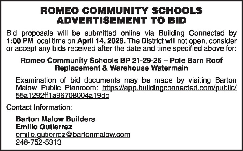 ROMEO COMMUNITY SCHOOLS ADVERTISEMENT TO BID Bid proposals will be submitted online via Building Connected by 1:00 PM local time on April 14, 2026. The District will not open, consider or accept any bids received after the date and time specified above for: Romeo Community Schools BP 21-29-26 – Pole Barn Roof Replacement & Warehouse Watermain Examination of bid documents may be made by visiting Barton Malow Public Planroom: https://app.buildingconnected.com/public/55a1292ff1a96708004a19dc Contact Information: Barton Malow Builders Emilio Gutierrez emilio.gutierrez@bartonmalow.com 248-752-5313