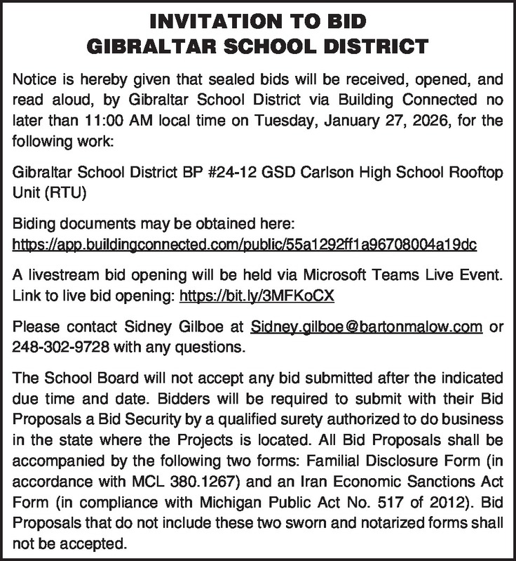 INVITATION TO BID GIBRALTAR SCHOOL DISTRICT Notice is hereby given that sealed bids will be received, opened, and read aloud, by Gibraltar School District via Building Connected no later than 11:00 AM local time on Tuesday, January 27, 2026, for the following work: Gibraltar School District BP #24-12 GSD Carlson High School Rooftop Unit (RTU) Biding documents may be obtained here: https://app.buildingconnected.com/public/55a1292ff1a96708004a19dc A livestream bid opening will be held via Microsoft Teams Live Event. Link to live bid opening: https://bit.ly/3MFKoCX Please contact Sidney Gilboe at Sidney.gilboe@bartonmalow.com or 248-302-9728 with any questions. The School Board will not accept any bid submitted after the indicated due time and date. Bidders will be required to submit with their Bid Proposals a Bid Security by a qualified surety authorized to do business in the state where the Projects is located. All Bid Proposals shall be accompanied by the following two forms: Familial Disclosure Form (in accordance with MCL 380.1267) and an Iran Economic Sanctions Act Form (in compliance with Michigan Public Act No. 517 of 2012). Bid Proposals that do not include these two sworn and notarized forms shall not be accepted.