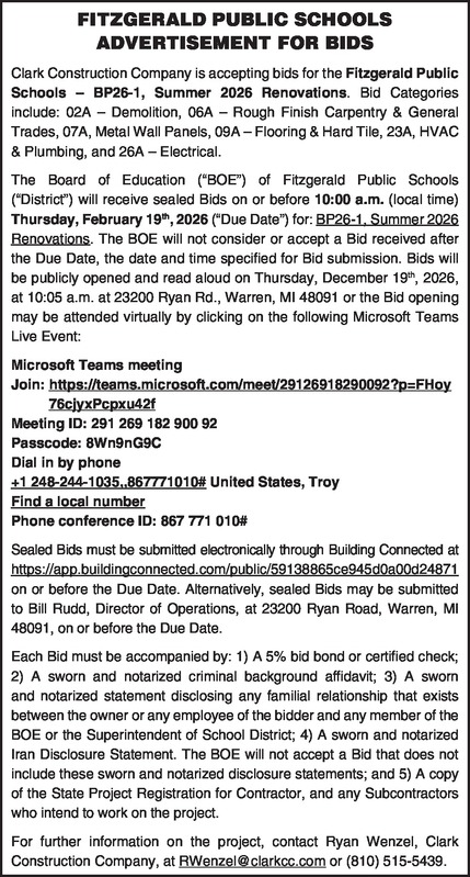 Bid PFITZGERALD PUBLIC SCHOOLS ADVERTISEMENT FOR BIDS Clark Construction Company is accepting bids for the Fitzgerald Public Schools – BP26-1, Summer 2026 Renovations. Bid Categories include: 02A – Demolition, 06A – Rough Finish Carpentry & General Trades, 07A, Metal Wall Panels, 09A – Flooring & Hard Tile, 23A, HVAC & Plumbing, and 26A – Electrical. The Board of Education (“BOE”) of Fitzgerald Public Schools (“District”) will receive sealed Bids on or before 10:00 a.m. (local time) Thursday, February 19th, 2026 (“Due Date”) for: BP26-1, Summer 2026 Renovations. The BOE will not consider or accept a Bid received after the Due Date, the date and time specified for Bid submission. Bids will be publicly opened and read aloud on Thursday, December 19th, 2026, at 10:05 a.m. at 23200 Ryan Rd., Warren, MI 48091 or the Bid opening may be attended virtually by clicking on the following Microsoft Teams Live Event: Microsoft Teams meeting Join: https://teams.microsoft.com/meet/29126918290092?p=FHoy76cjyxPcpxu42f Meeting ID: 291 269 182 900 92 Passcode: 8Wn9nG9C Dial in by phone +1 248-244-1035,,867771010# United States, Troy Find a local number Phone conference ID: 867 771 010# Sealed Bids must be submitted electronically through Building Connected at https://app.buildingconnected.com/public/59138865ce945d0a00d24871 on or before the Due Date. Alternatively, sealed Bids may be submitted to Bill Rudd, Director of Operations, at 23200 Ryan Road, Warren, MI 48091, on or before the Due Date. Each Bid must be accompanied by: 1) A 5% bid bond or certified check; 2) A sworn and notarized criminal background affidavit; 3) A sworn and notarized statement disclosing any familial relationship that exists between the owner or any employee of the bidder and any member of the BOE or the Superintendent of School District; 4) A sworn and notarized Iran Disclosure Statement. The BOE will not accept a Bid that does not include these sworn and notarized disclosure statements; and 5) A copy of the State Project Registration for Contractor, and any Subcontractors who intend to work on the project. For further information on the project, contact Ryan Wenzel, Clark Construction Company, at RWenzel@clarkcc.com or (810) 515-5439.