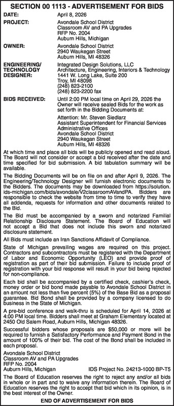SECTION 00 1113 - ADVERTISEMENT FOR BIDS DATE: April 8, 2026 PROJECT: Avondale School District Classroom AV and PA Upgrades RFP No. 2004 Auburn Hills, Michigan OWNER: Avondale School District 2940 Waukegan Street Auburn Hills, MI 48326 ENGINEERING/ TECHNOLOGY DESIGNER: Integrated Design Solutions, LLC Architecture, Engineering, Interiors & Technology 1441 W. Long Lake, Suite 200 Troy, MI 48098 (248) 823-2100 (248) 823-2200 fax BIDS RECEIVED: Until 3:00 PM local time on April 23, 2026 the Owner will receive sealed Bids for the work as set forth in the Bidding Documents at: Attention: Mr. Steven Siedlarz Assistant Superintendent for Financial Services Administrative Offices Avondale School District 2940 Waukegan Street Auburn Hills, MI 48326 At which time and place all bids will be publicly opened and read aloud. The Board will not consider or accept a bid received after the date and time specified for bid submission. A bid tabulation summary will be available. The Bidding Documents will be on file on and after April 9, 2026. The Engineering/Technology Designer will furnish electronic documents to the Bidders. The documents may be downloaded from https://solution.ids-michigan.com/bids/avondale/V2classroomAVandPA. Bidders are responsible to check the website from time to time to verify they have all addenda, requests for information and other documents related to the Bid. The Bid must be accompanied by a sworn and notarized Familial Relationship Disclosure Statement. The Board of Education will not accept a Bid that does not include this sworn and notarized disclosure statement. All Bids must include an Iran Sanctions Affidavit of Compliance. State of Michigan prevailing wages are required on this project. Contractors and subcontractors must be registered with the Department of Labor and Economic Opportunity (LEO) and provide proof of registration as part of their bid submission. Failure to include proof of registration with your bid response will result in your bid being rejected for non-compliance. Each bid shall be accompanied by a certified check, cashier’s check, money order or bid bond made payable to Avondale School District in an amount not less than five percent (5%) of the Base Bid as a proposal guarantee. Bid Bond shall be provided by a company licensed to do business in the State of Michigan. A pre-bid conference and walk-thru is scheduled for April 14, 2026 at 4:00 PM local time. Bidders shall meet at Graham Elementary located at 2450 Old Salem Road, Auburn Hills, Michigan 48326. Successful bidders whose proposals are $50,000 or more will be required to furnish a Satisfactory Performance and Payment Bond in the amount of 100% of their bid. The cost of the Bond shall be included in each proposal. The Board of Education reserves the right to reject any and/or all bids in whole or in part and to waive any information therein. The Board of Education reserves the right to accept that bid which in its opinion, is in the best interest of the Owner. END OF