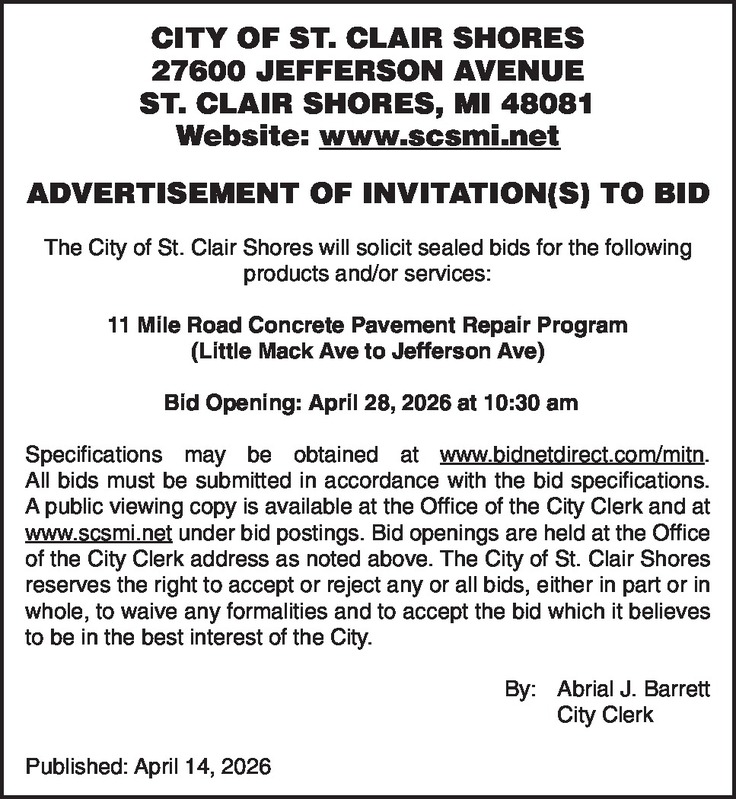CITY OF ST. CLAIR SHORES 27600 JEFFERSON AVENUE ST. CLAIR SHORES, MI 48081 Website: www.scsmi.net ADVERTISEMENT OF INVITATION(S) TO BID The City of St. Clair Shores will solicit sealed bids for the following products and/or services: 11 Mile Road Concrete Pavement Repair Program (Little Mack Ave to Jefferson Ave) Bid Opening: April 28, 2026 at 10:30 am Specifications may be obtained at www.bidnetdirect.com/mitn. All bids must be submitted in accordance with the bid specifications. A public viewing copy is available at the Office of the City Clerk and at www.scsmi.net under bid postings. Bid openings are held at the Office of the City Clerk address as noted above. The City of St. Clair Shores reserves the right to accept or reject any or all bids, either in part or in whole, to waive any formalities and to accept the bid which it believes to be in the best interest of the City. By: Abrial J. Barrett City Clerk Published: April 14, 2026