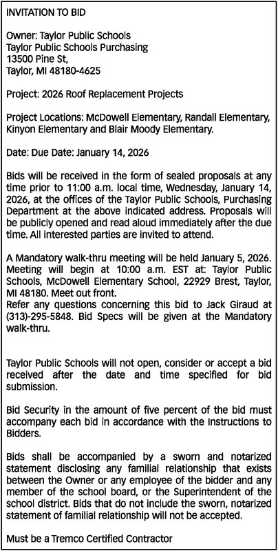 INVITATION TO BID Owner: Taylor Public Schools Taylor Public Schools Purchasing 13500 Pine St, Taylor, MI 48180-4625 Project: 2026 Roof Replacement Projects Project Locations: McDowell Elementary, Randall Elementary, Kinyon Elementary and Blair Moody Elementary. Date: Due Date: January 14, 2026 Bids will be received in the form of sealed proposals at any time prior to 11:00 a.m. local time, Wednesday, January 14, 2026, at the offices of the Taylor Public Schools, Purchasing Department at the above indicated address. Proposals will be publicly opened and read aloud immediately after the due time. All interested parties are invited to attend. A Mandatory walk-thru meeting will be held January 5, 2026. Meeting will begin at 10:00 a.m. EST at: Taylor Public Schools, McDowell Elementary School, 22929 Brest, Taylor, MI 48180. Meet out front. Refer any questions concerning this bid to Jack Giraud at (313)-295-5848. Bid Specs will be given at the Mandatory walk-thru. Taylor Public Schools will not open, consider or accept a bid received after the date and time specified for bid submission. Bid Security in the amount of five percent of the bid must accompany each bid in accordance with the Instructions to Bidders. Bids shall be accompanied by a sworn and notarized statement disclosing any familial relationship that exists between the Owner or any employee of the bidder and any member of the school board, or the Superintendent of the school district. Bids that do not include the sworn, notarized statement of familial relationship will not be accepted. Must be a Tremco Certified Contractor