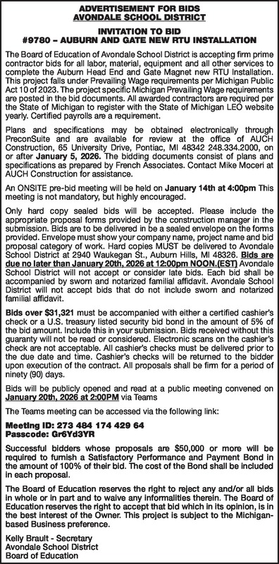 ADVERTISEMENT FOR BIDS AVONDALE SCHOOL DISTRICT INVITATION TO BID #9780 – AUBURN AND GATE NEW RTU INSTALLATION The Board of Education of Avondale School District is accepting firm prime contractor bids for all labor, material, equipment and all other services to complete the Auburn Head End and Gate Magnet new RTU Installation. This project falls under Prevailing Wage requirements per Michigan Public Act 10 of 2023. The project specific Michigan Prevailing Wage requirements are posted in the bid documents. All awarded contractors are required per the State of Michigan to register with the State of Michigan LEO website yearly. Certified payrolls are a requirement. Plans and specifications may be obtained electronically through PreconSuite and are available for review at the office of AUCH Construction, 65 University Drive, Pontiac, MI 48342 248.334.2000, on or after January 5, 2026. The bidding documents consist of plans and specifications as prepared by French Associates. Contact Mike Moceri at AUCH Construction for assistance. An ONSITE pre-bid meeting will be held on January 14th at 4:00pm This meeting is not mandatory, but highly encouraged. Only hard copy sealed bids will be accepted. Please include the appropriate proposal forms provided by the construction manager in the submission. Bids are to be delivered in be a sealed envelope on the forms provided. Envelope must show your company name, project name and bid proposal category of work. Hard copies MUST be delivered to Avondale School District at 2940 Waukegan St., Auburn Hills, MI 48326. Bids are due no later than January 20th, 2026 at 12:00pm NOON.(EST) Avondale School District will not accept or consider late bids. Each bid shall be accompanied by sworn and notarized familial affidavit. Avondale School District will not accept bids that do not include sworn and notarized familial affidavit. Bids over $31,321 must be accompanied with either a certified cashier’s check or a U.S. treasury listed security bid bond in the amount of 5% of the bid amount. Include this in your submission. Bids received without this guaranty will not be read or considered. Electronic scans on the cashier’s check are not acceptable. All cashier’s checks must be delivered prior to the due date and time. Cashier’s checks will be returned to the bidder upon execution of the contract. All proposals shall be firm for a period of ninety (90) days. Bids will be publicly opened and read at a public meeting convened on January 20th, 2026 at 2:00PM via Teams The Teams meeting can be accessed via the following link: Meeting ID: 273 484 174 429 64 Passcode: Gr6Yd3YR Successful bidders whose proposals are $50,000 or more will be required to furnish a Satisfactory Performance and Payment Bond in the amount of 100% of their bid. The cost of the Bond shall be included in each proposal. The Board of Education reserves the right to reject any and/or all bids in whole or in part and to waive any informalities therein. The Board of Education reserves the right to accept that bid which in its opinion, is in the best interest of the Owner. This project is subject to the Michigan-based Business preference. Kelly Brault - Secretary Avondale School District Board of Education