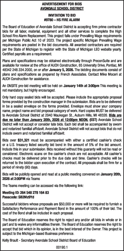 ADVERTISEMENT FOR BIDS AVONDALE SCHOOL DISTRICT INVITATION TO BID #9780 – HS FIRE ALARM The Board of Education of Avondale School District is accepting firm prime contractor bids for all labor, material, equipment and all other services to complete the High School Fire Alarm Replacement. This project falls under Prevailing Wage requirements per Michigan Public Act 10 of 2023. The project specific Michigan Prevailing Wage requirements are posted in the bid documents. All awarded contractors are required per the State of Michigan to register with the State of Michigan LEO website yearly. Certified payrolls are a requirement. Plans and specifications may be obtained electronically through PreconSuite and are available for review at the office of AUCH Construction, 65 University Drive, Pontiac, MI 48342 248.334.2000, on or after January 5, 2026. The bidding documents consist of plans and specifications as prepared by French Associates. Contact Mike Moceri at AUCH Construction for assistance. An ONSITE pre-bid meeting will be held on January 14th at 3:00pm This meeting is not mandatory, but highly encouraged. Only hard copy sealed bids will be accepted. Please include the appropriate proposal forms provided by the construction manager in the submission. Bids are to be delivered in be a sealed envelope on the forms provided. Envelope must show your company name, project name and bid proposal category of work. Hard copies MUST be delivered to Avondale School District at 2940 Waukegan St., Auburn Hills, MI 48326. Bids are due no later than January 20th, 2026 at 12:00pm NOON.(EST) Avondale School District will not accept or consider late bids. Each bid shall be accompanied by sworn and notarized familial affidavit. Avondale School District will not accept bids that do not include sworn and notarized familial affidavit. Bids over $31,321 must be accompanied with either a certified cashier’s check or a U.S. treasury listed security bid bond in the amount of 5% of the bid amount. Include this in your submission. Bids received without this guaranty will not be read or considered. Electronic scans on the cashier’s check are not acceptable. All cashier’s checks must be delivered prior to the due date and time. Cashier’s checks will be returned to the bidder upon execution of the contract. All proposals shall be firm for a period of ninety (90) days. Bids will be publicly opened and read at a public meeting convened on January 20th, 2026 at 2:00PM via Teams The Teams meeting can be accessed via the following link: Meeting ID: 264 548 278 164 83 Passcode: SB2Mz9Yd Successful bidders whose proposals are $50,000 or more will be required to furnish a Satisfactory Performance and Payment Bond in the amount of 100% of their bid. The cost of the Bond shall be included in each proposal. The Board of Education reserves the right to reject any and/or all bids in whole or in part and to waive any informalities therein. The Board of Education reserves the right to accept that bid which in its opinion, is in the best interest of the Owner. This project is subject to the Michigan-based Business preference. Kelly Brault - Secretary Avondale School District Board of Education