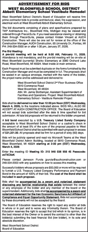 ADVERTISEMENT FOR BIDS WEST BLOOMFIELD SCHOOL DISTRICT Abbott Elementary School Vestibule Remodel West Bloomfield School District’s Board of Education will receive firm prime contractor bids to provide architectural, steel, fire suppression, and electrical work at West Bloomfield Abbott Elementary School. The bid documents consisting of plans and specifications prepared by TMP Architecture Inc., Bloomfield Hills, Michigan may be viewed and ordered through PreconSuite. If you need assistance viewing or obtaining them through PreconSuite, please contact Kirsten Vincent at AUCH Construction. There will also be one set for review at the office of the Construction Manager, AUCH Construction, 65 University Dr., Pontiac, MI PH: 248-334-2000 on or after 1:00 pm, January 27, 2026. Pre Bid Meeting: A pre-bid meeting will be held at 9:00 AM, February 11, 2026. Attendance is not mandatory, and the pre-bid meeting will be on-site at West Bloomfield (currently) Sheiko Elementary at 3380 Orchard Lake Road, West Bloomfield, MI 48324. Meet inside at main entrance. Each Proposal must be submitted duplicate on the forms furnished by the Construction Manager and must be completed in full. The proposals shall be sealed in an opaque envelope, marked with the name of the bidder, the project name and be addressed and delivered to: West Bloomfield School District 2nd Floor Business Office 5810 Commerce Road West Bloomfield, MI 48324 Attn: Mr. Jamie Stottlemyer, Assistant Superintendent of Facilities and Operations. Project: West Bloomfield Abbott Elementary School - Vestibule Remodel Project Bids shall be delivered no later than 12:00 pm Noon (EST) Wednesday March 4, 2026, to the locations indicated above. BIDS WILL ALSO BE ACCEPT AT AUCH CONSTRUCTION OFFICE. The Board of Education will not accept bids submitted after the date & time specified for bid submission. All late bid proposals will be returned to the bidder unopened. A bid bond executed by a U.S. Treasury Listed Surety Company acceptable to West Bloomfield School District or a cashier’s check in the amount of at least 5% of the sum of the proposal payable to West Bloomfield School District shall be submitted with each proposal in excess of $31,321.00. All proposals shall be firm for a period of sixty (60) days. Bids will be publicly opened and read via Microsoft Teams at the West Bloomfield District Admin Building, located at 5810 Commerce Road, West Bloomfield, MI 48324 starting at 2:00 pm (EST) Wednesday March 4, 2026 Enter the meeting ID Meeting ID: 210 946 038 956 45 Passcode: zx7XC9zK Please contact Jameson Purola jpurola@auchconstruction.com or 248-334-2000 with any questions on how to access this meeting. Successful bidders whose proposals are $50,000 or more will be required to furnish a U.S. Treasury Listed Company Performance and Payment Bond in the amount of 100% of their bid. The cost of the Bond shall be included in each proposal. Bids shall be accompanied by a sworn and notarized statement disclosing any familial relationship that exists between the owner or any employee of the bidder and any member of the board or the superintendent. Additionally, bids shall be accompanied by a sworn and notarized statement for the Iran Economic Sanctions Act Affidavit of Compliance and Equal Opportunity Statement. Bids not accompanied by these documents will not be accepted by the Board. The Board of Education reserves the right to reject any and/or all bids in whole or in part and to waive any informality therein. The Board of Education reserves the right to accept that bid which in its opinion, is in the best interest of the Owner or to award the contract to other than the bidder(s) submitting the best financial Bid (low bidder), in its sole and absolute discretion. West Bloomfield School District Board of Education