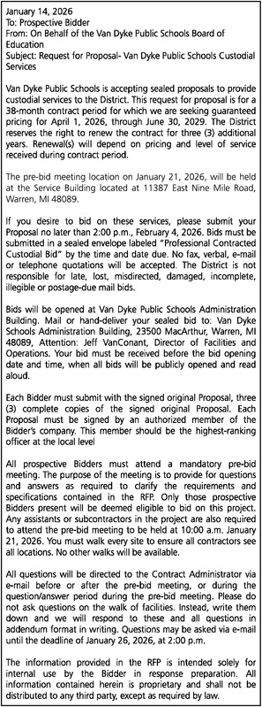 January 14, 2026 To: Prospective Bidder From: On Behalf of the Van Dyke Public Schools Board of Education Subject: Request for Proposal- Van Dyke Public Schools Custodial Services Van Dyke Public Schools is accepting sealed proposals to provide custodial services to the District. This request for proposal is for a 38-month contract period for which we are seeking guaranteed pricing for April 1, 2026, through June 30, 2029. The District reserves the right to renew the contract for three (3) additional years. Renewal(s) will depend on pricing and level of service received during contract period. The pre-bid meeting location on January 21, 2026, will be held at the Service Building located at 11387 East Nine Mile Road, Warren, MI 48089. If you desire to bid on these services, please submit your Proposal no later than 2:00 p.m., February 4, 2026. Bids must be submitted in a sealed envelope labeled “Professional Contracted Custodial Bid” by the time and date due. No fax, verbal, e-mail or telephone quotations will be accepted. The District is not responsible for late, lost, misdirected, damaged, incomplete, illegible or postage-due mail bids. Bids will be opened at Van Dyke Public Schools Administration Building. Mail or hand-deliver your sealed bid to: Van Dyke Schools Administration Building, 23500 MacArthur, Warren, MI 48089, Attention: Jeff VanConant, Director of Facilities and Operations. Your bid must be received before the bid opening date and time, when all bids will be publicly opened and read aloud. Each Bidder must submit with the signed original Proposal, three (3) complete copies of the signed original Proposal. Each Proposal must be signed by an authorized member of the Bidder’s company. This member should be the highest-ranking officer at the local level All prospective Bidders must attend a mandatory pre-bid meeting. The purpose of the meeting is to provide for questions and answers as required to clarify the requirements and specifications contained in the RFP. Only those prospective Bidders present will be deemed eligible to bid on this project. Any assistants or subcontractors in the project are also required to attend the pre-bid meeting to be held at 10:00 a.m. January 21, 2026. You must walk every site to ensure all contractors see all locations. No other walks will be available. All questions will be directed to the Contract Administrator via e-mail before or after the pre-bid meeting, or during the question/answer period during the pre-bid meeting. Please do not ask questions on the walk of facilities. Instead, write them down and we will respond to these and all questions in addendum format in writing. Questions may be asked via e-mail until the deadline of January 26, 2026, at 2:00 p.m. The information provided in the RFP is intended solely for internal use by the Bidder in response preparation. All information contained herein is proprietary and shall not be distributed to any third party, except as required by law.