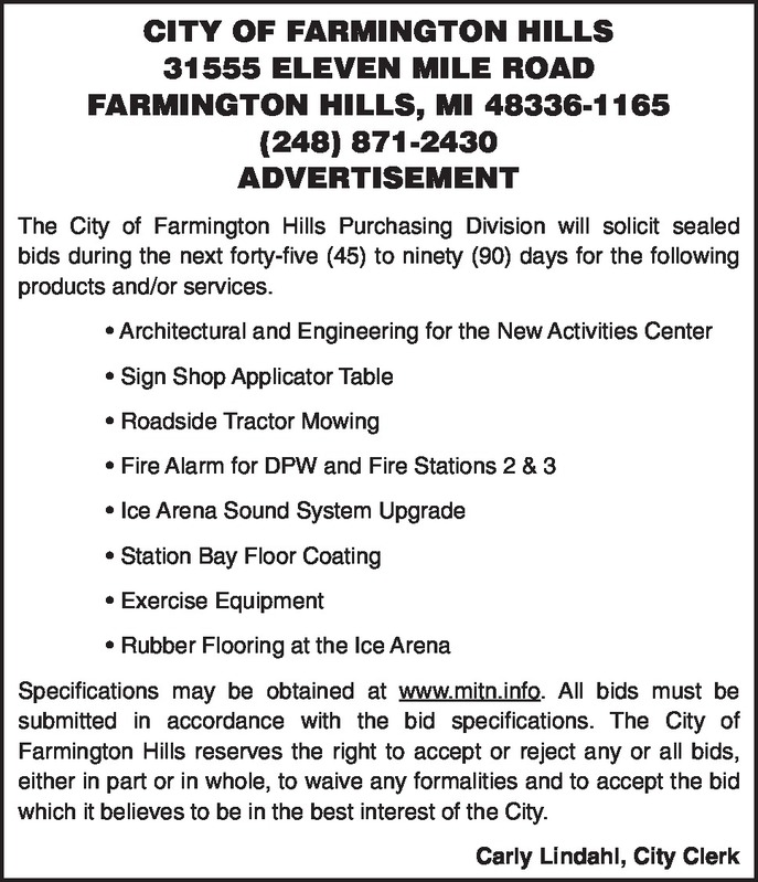 CITY OF FARMINGTON HILLS 31555 ELEVEN MILE ROAD FARMINGTON HILLS, MI 48336-1165 (248) 871-2430 ADVERTISEMENT The City of Farmington Hills Purchasing Division will solicit sealed bids during the next forty-five (45) to ninety (90) days for the following products and/or services. Architectural and Engineering for the New Activities Center Sign Shop Applicator Table Roadside Tractor Mowing Fire Alarm for DPW and Fire Stations 2 & 3 Ice Arena Sound System Upgrade Station Bay Floor Coating Exercise Equipment Rubber Flooring at the Ice Arena Specifications may be obtained at www.mitn.info . All bids must be submitted in accordance with the bid specifications. The City of Farmington Hills reserves the right to accept or reject any or all bids, either in part or in whole, to waive any formalities and to accept the bid which it believes to be in the best interest of the City. Carly Lindahl, City Clerk