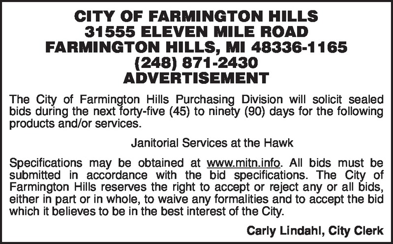 CITY OF FARMINGTON HILLS 31555 ELEVEN MILE ROAD FARMINGTON HILLS, MI 48336-1165 (248) 871-2430 ADVERTISEMENT The City of Farmington Hills Purchasing Division will solicit sealed bids during the next forty-five (45) to ninety (90) days for the following products and/or services. Janitorial Services at the Hawk Specifications may be obtained at www.mitn.info . All bids must be submitted in accordance with the bid specifications. The City of Farmington Hills reserves the right to accept or reject any or all bids, either in part or in whole, to waive any formalities and to accept the bid which it believes to be in the best interest of the City. Carly Lindahl, City Clerk