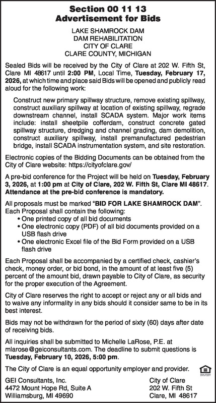 Section 00 11 13 Advertisement for Bids LAKE SHAMROCK DAM DAM REHABILITATION CITY OF CLARE CLARE COUNTY, MICHIGAN Sealed Bids will be received by the City of Clare at 202 W. Fifth St, Clare MI 48617 until 2:00 PM, Local Time, Tuesday, February 17, 2026, at which time and place said Bids will be opened and publicly read aloud for the following work: Construct new primary spillway structure, remove existing spillway, construct auxiliary spillway at location of existing spillway, regrade downstream channel, install SCADA system. Major work items include: install sheetpile cofferdam, construct concrete gated spillway structure, dredging and channel grading, dam demolition, construct auxiliary spillway, install premanufactured pedestrian bridge, install SCADA instrumentation system, and site restoration. Electronic copies of the Bidding Documents can be obtained from the City of Clare website: https://cityofclare.gov/ A pre-bid conference for the Project will be held on Tuesday, February 3, 2026, at 1:00 pm at City of Clare, 202 W. Fifth St, Clare MI 48617. Attendance at the pre-bid conference is mandatory. All proposals must be marked “BID FOR LAKE SHAMROCK DAM”. Each Proposal shall contain the following: • One printed copy of all bid documents • One electronic copy (PDF) of all bid documents provided on a USB flash drive • One electronic Excel file of the Bid Form provided on a USB flash drive Each Proposal shall be accompanied by a certified check, cashier’s check, money order, or bid bond, in the amount of at least five (5) percent of the amount bid, drawn payable to City of Clare, as security for the proper execution of the Agreement. City of Clare reserves the right to accept or reject any or all bids and to waive any informality in any bids should it consider same to be in its best interest. Bids may not be withdrawn for the period of sixty (60) days after date of receiving bids. All inquiries shall be submitted to Michelle LaRose, P.E. at mlarose@geiconsultants.com. The deadline to submit questions is Tuesday, February 10, 2026, 5:00 pm. The City of Clare is an equal opportunity employer and provider. GEI Consultants, Inc. City of Clare 4472 Mount Hope Rd, Suite A 202 W. Fifth St Williamsburg, MI 49690 Clare, MI 48617
