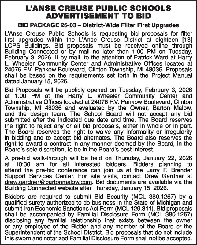 L’ANSE CREUSE PUBLIC SCHOOLS ADVERTISEMENT TO BID BID PACKAGE 26-03 – District-Wide Filter First Upgrades L’Anse Creuse Public Schools is requesting bid proposals for filter first upgrades within the L’Anse Creuse District at eighteen [18] LCPS Buildings. Bid proposals must be received online through Building Connected or by mail no later than 1:00 PM on Tuesday, February 3, 2026. If by mail, to the attention of Patrick Ward at Harry L. Wheeler Community Center and Administrative Offices located at 24076 F.V. Pankow Boulevard, Clinton Township, MI 48036. Proposals shall be based on the requirements set forth in the Project Manual dated January 15, 2026. Bid Proposals will be publicly opened on Tuesday, February 3, 2026 at 1:00 PM at the Harry L. Wheeler Community Center and Administrative Offices located at 24076 F.V. Pankow Boulevard, Clinton Township, MI 48036 and evaluated by the Owner, Barton Malow, and the design team. The School Board will not accept any bid submitted after the indicated due date and time. The Board reserves the right to reject any or all bid proposals, either in whole or in part. The Board reserves the right to waive any informality or irregularity in bidding and to accept bid alternates. The Board also reserves the right to award a contract in any manner deemed by the Board, in the Board’s sole discretion, to be in the Board’s best interest. A pre-bid walk-through will be held on Thursday, January 22, 2026 at 10:30 am for all interested bidders. Bidders planning to attend the pre-bid conference can join us at the Larry F. Brender Support Services Center. For site visits, contact Drew Gardner at drew.gardner@bartonmalow.com. Bid documents are available via the Building Connected website after Thursday, January 15, 2026. Bidders are required to submit Bid Security (MCL 380.1267) by a qualified surety authorized to do business in the State of Michigan and submit Iran Economic Sanctions Act Form (MCL 129.311). Bid proposals shall be accompanied by Familial Disclosure Form (MCL 380.1267) disclosing any familial relationship that exists between the owner or any employee of the Bidder and any member of the Board or the Superintendent of the School District. Bid proposals that do not include this sworn and notarized Familial Disclosure Form shall not be accepted.