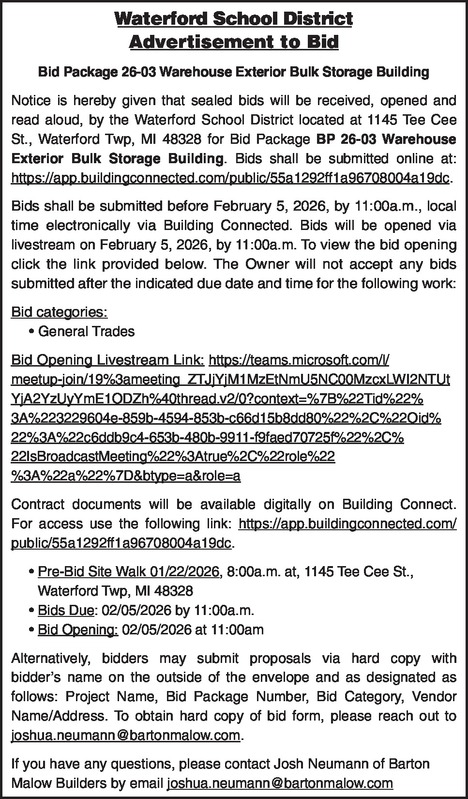 Waterford School District Advertisement to Bid Bid Package 26-03 Warehouse Exterior Bulk Storage Building Notice is hereby given that sealed bids will be received, opened and read aloud, by the Waterford School District located at 1145 Tee Cee St., Waterford Twp, MI 48328 for Bid Package BP 26-03 Warehouse Exterior Bulk Storage Building. Bids shall be submitted online at: https://app.buildingconnected.com/public/55a1292ff1a96708004a19dc. Bids shall be submitted before February 5, 2026, by 11:00 a.m., local time electronically via Building Connected. Bids will be opened via livestream on February 5, 2026, by 11:00 a.m. To view the bid opening click the link provided below. The Owner will not accept any bids submitted after the indicated due date and time for the following work: Bid categories: • General Trades Bid Opening Livestream Link: https://teams.microsoft.com/l/meetup- join/19%3ameeting_ZTJjYjM1MzEtNmU5NC00MzcxLWI2NTUtYjA2YzUyYmE1ODZh%40thre ad.v2/0?context=%7B%22Tid%22%3A%223229604e-859b-4594-853b- c66d15b8dd80%22%2C%22Oid%22%3A%22c6ddb9c4-653b-480b-9911- f9faed70725f%22%2C%22IsBroadcastMeeting%22%3Atrue%2C%22role%22%3A%22a%2 2%7D&btype=a&role=a Contract documents will be available digitally on Building Connect. For access use the following link: https://app.buildingconnected.com/public/55a1292ff1a96708004a19dc. • Pre-Bid Site Walk 01/22/2026, 8:00 a.m. at, 1145 Tee Cee St., Waterford Twp, MI 48328 • Bids Due: 02/05/2026 by 11:00a.m. • Bid Opening: 02/05/2026 at 11:00am Alternatively, bidders may submit proposals via hard copy with bidder’s name on the outside of the envelope and as designated as follows: Project Name, Bid Package Number, Bid Category, Vendor Name/Address. To obtain hard copy of bid form, please reach out to joshua.neumann@bartonmalow.com . If you have any questions, please contact Josh Neumann of Barton Malow Builders by email joshua.neumann@bartonmalow.com