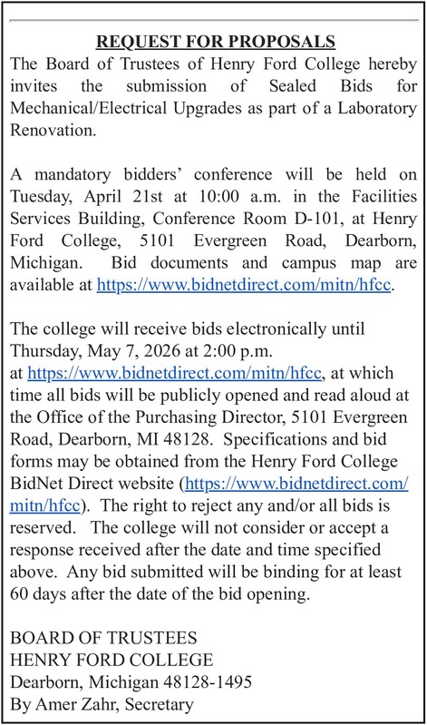 REQUEST FOR PROPOSALS The Board of Trustees of Henry Ford College hereby invites the submission of Sealed Bids for Mechanical/Electrical Upgrades as part of a Laboratory Renovation. A mandatory bidders’ conference will be held on Tuesday, April 21st at 10:00 a.m. in the Facilities Services Building, Conference Room D-101, at Henry Ford College, 5101 Evergreen Road, Dearborn, Michigan. Bid documents and campus map are available at https://www.bidnetdirect.com/ mitn/hfcc . The college will receive bids electronically until Thursday, May 7, 2026 at 2:00 p.m. at https://www.bidnetdirect.com/ mitn/hfcc , at which time all bids will be publicly opened and read aloud at the Office of the Purchasing Director, 5101 Evergreen Road, Dearborn, MI 48128. Specifications and bid forms may be obtained from the Henry Ford College BidNet Direct website ( https://www.bidnetdirect.com/ mitn/hfcc ). The right to reject any and/or all bids is reserved. The college will not consider or accept a response received after the date and time specified above. Any bid submitted will be binding for at least 60 days after the date of the bid opening. BOARD OF TRUSTEES HENRY FORD COLLEGE Dearborn, Michigan 48128-1495 By Amer Zahr, Secretary
