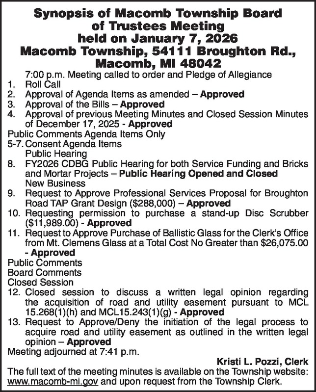 MACOMB TOWNSHIP BOARD OF TRUSTEES MEETING MINUTES WEDNESDAY, JANUARY 7, 2026 LOCATION: MACOMB TOWNSHIP MEETING CHAMBERS 54111 BROUGHTON ROAD, MACOMB MI 48042 Call Meeting to Order Meeting was called to order by Supervisor Viviano at 6:30 p.m. Pledge of Allegiance to the Flag of the United States Pledge of Allegiance was recited by all in attendance. 1. Roll Call Clerk Pozzi called the roll: Present: Frank A. Cusumano Jr., Peter J. Lucido III, Charles Oliver, Ronald Papa, Leon Drolet, Kristi Pozzi, Frank Viviano Absent: 2. Approval of Agenda Items (with any corrections) MOTION by Leon Drolet seconded by Peter J. Lucido III to approve the agenda as amended with the addition of Item 13, Request to Approve/Deny the initiation of the legal process to acquire road and utility easement as outlined in the written legal opinion. Vote Summary: (7 - 0 - 0) Ayes - Frank A. Cusumano Jr., Peter J. Lucido III, Charles Oliver, Ronald Papa, Leon Drolet, Kristi Pozzi, Frank Viviano Nays - None Abstain - None THE MOTION Passed. 3. Approval of Bills MOTION by Leon Drolet seconded by Ronald Papa to approve the bills as presented. Vote Summary: (7 - 0 - 0) Ayes - Frank A. Cusumano Jr., Peter J. Lucido III, Charles Oliver, Ronald Papa, Leon Drolet, Kristi Pozzi, Frank Viviano Nays - None Abstain - None THE MOTION Passed. 4. Approval of Previous Meeting Minutes from December 17, 2025 and Closed Session Meeting Minutes from December 17, 2025 MOTION by Charles Oliver seconded by Leon Drolet to approve meeting minutes from December 17, 2025 and Closed Session Meeting Minutes from December 17, 2025 as presented. Vote Summary: (7 - 0 - 0) Ayes - Frank A. Cusumano Jr., Peter J. Lucido III, Charles Oliver, Ronald Papa, Leon Drolet, Kristi Pozzi, Frank Viviano Nays - None Abstain - None THE MOTION Passed. PUBLIC COMMENTS, AGENDA ITEMS ONLY - (3 MINUTE TIME LIMIT) There were no public comments. CONSENT AGENDA ITEMS: MOTION by Leon Drolet seconded by Peter J. Lucido III to approve the Consent Agenda items as presented. Vote Summary: (7 - 0 - 0) Ayes - Frank A. Cusumano Jr., Peter J. Lucido III, Charles Oliver, Ronald Papa, Leon Drolet, Kristi Pozzi, Frank Viviano Nays - None Abstain - None THE MOTION Passed. 5. Engineering Department a. Request to Approve Easement Agreement: 2026 Pathway Gap Closure Program (Parcel No. 08-33-400-007) b. Request to Schedule Public Hearing for Street Lighting SAD Resolution for Penzien Estates Site Condominium for February 11, 2026 c. Request to Approve Easement Agreement: 2026 Pathway Gap Closure Program (Parcel No. 08-34-300-002) 6. Department of Public Works a. Request to approve the Neptune 360 Advanced Metering Infrastructure software annual maintenance fee to Ferguson Waterworks. ($71,349.53) b. Request to approve a non-dissemination agreement between Metronet and Macomb Township 7. Supervisor's Office a. Request to Approve Amendment to Legal Services Contract PUBLIC HEARING: 8. FY2026 CDBG Public Hearing for both Service Funding and Bricks and Mortar Projects Supervisor Viviano opened the Public Hearing at 6:37 PM. Representatives from Samaritan House, Hearts for Homes, Care House, Maggie's Wigs for Kids of Michigan and Interfaith Volunteer Caregivers made presentations to the Board. Supervisor Viviano closed the Public Hearing at 6:50 PM. NEW BUSINESS: ENGINEERING DEPARTMENT: 9. Request to Approve Professional Services Proposal for Broughton Road TAP Grant Design ($288,000) MOTION by Charles Oliver seconded by Leon Drolet to Approve Professional Services Proposal for Broughton Road TAP Grant Design ($270,000). Vote Summary: (7 - 0 - 0) Ayes - Frank A. Cusumano Jr., Peter J. Lucido III, Charles Oliver, Ronald Papa, Leon Drolet, Kristi Pozzi, Frank Viviano Nays - None Abstain - None THE MOTION Passed. PARKS AND RECREATION DEPARTMENT: 10. Requesting permission to purchase a stand-up Disc Scrubber ($11,989.00) MOTION by Leon Drolet seconded by Peter J. Lucido III to purchase a stand-up Floor Disc Scrubber ($11,989.00). Vote Summary: (7 - 0 - 0) Ayes - Frank A. Cusumano Jr., Peter J. Lucido III, Charles Oliver, Ronald Papa, Leon Drolet, Kristi Pozzi, Frank Viviano Nays - None Abstain - None THE MOTION Passed. SUPERVISOR’S OFFICE: 11. Request to Approve Purchase of Ballistic Glass for the Clerk's Office from Mt. Clemens Glass at a Total Cost No Greater than $26,075.00 MOTION by Ronald Papa seconded by Charles Oliver to Approve the Purchase of Ballistic Glass for the Clerk's Office from Mt. Clemens Glass ($22,940.00). Vote Summary: (7 - 0 - 0) Ayes - Frank A. Cusumano Jr., Peter J. Lucido III, Charles Oliver, Ronald Papa, Leon Drolet, Kristi Pozzi, Frank Viviano Nays - None Abstain - None THE MOTION Passed. PUBLIC COMMENTS, NON-AGENDA ITEMS ONLY - (3 MINUTE TIME LIMIT) One resident spoke during public comments. BOARD COMMENTS: Trustees Comments Trustees Lucido, Papa and Oliver wished everyone a Happy New Year and thanked the organizations that presented during the CDBG Public Hearing. Treasurer Comments Treasurer Drolet wished everyone a Happy New Year. Clerk Comments Clerk Pozzi had no comments. Supervisor Comments Supervisor Viviano thanked the human service organizations that attended the meeting. He also announced the Winter Photo Contest has begun and Town Hall will be closed on January 19, 2026 in observance of Dr. Martin Luther King Jr. Day. CLOSED SESSION 12. Closed session to discuss a written legal opinion regarding the acquisition of road and utility easement pursuant to MCL 15.268(1)(h) and MCL15.243(1)(g) MOTION by Leon Drolet seconded by Peter J. Lucido III to enter closed session to discuss a written legal opinion regarding the acquisition of road and utility easement pursuant to MCL 15.268(1)(h) and MCL15.243(1)(g). Roll Call Vote Summary: (7 - 0 - 0) Ayes - Leon Drolet, Peter J. Lucido III, Frank A. Cusumano Jr., Charles Oliver, Ronald Papa, Kristi Pozzi, Frank Viviano Nays - None Abstain - None THE MOTION Passed. The Board entered Closed Session at 7:04 PM and returned