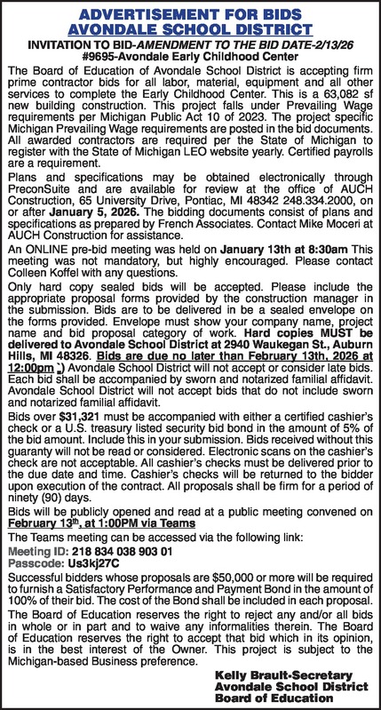 ADVERTISEMENT FOR BIDS AVONDALE SCHOOL DISTRICT INVITATION TO BID- AMENDMENT TO THE BID DATE -2/13/26 #9695 – Avondale Early Childhood Center The Board of Education of Avondale School District is accepting firm prime contractor bids for all labor, material, equipment and all other services to complete the Early Childhood Center. This is a 63,082 sf new building construction. This project falls under Prevailing Wage requirements per Michigan Public Act 10 of 2023. The project specific Michigan Prevailing Wage requirements are posted in the bid documents. All awarded contractors are required per the State of Michigan to register with the State of Michigan LEO website yearly. Certified payrolls are a requirement. Plans and specifications may be obtained electronically through PreconSuite and are available for review at the office of AUCH Construction, 65 University Drive, Pontiac, MI 48342 248.334.2000, on or after January 5, 2026. The bidding documents consist of plans and specifications as prepared by French Associates. Contact Mike Moceri at AUCH Construction for assistance. An ONLINE pre-bid meeting was held on January 13th at 8:30am This meeting was not mandatory, but highly encouraged. Please contact Colleen Koffel with any questions. Only hard copy sealed bids will be accepted. Please include the appropriate proposal forms provided by the construction manager in the submission. Bids are to be delivered in be a sealed envelope on the forms provided. Envelope must show your company name, project name and bid proposal category of work. Hard copies MUST be delivered to Avondale School District at 2940 Waukegan St., Auburn Hills, MI 48326. Bids are due no later than February 13th, 2026 at 12:00pm `) Avondale School District will not accept or consider late bids. Each bid shall be accompanied by sworn and notarized familial affidavit. Avondale School District will not accept bids that do not include sworn and notarized familial affidavit. Bids over $31,321 must be accompanied with either a certified cashier’s check or a U.S. treasury listed security bid bond in the amount of 5% of the bid amount. Include this in your submission. Bids received without this guaranty will not be read or considered. Electronic scans on the cashier’s check are not acceptable. All cashier’s checks must be delivered prior to the due date and time. Cashier’s checks will be returned to the bidder upon execution of the contract. All proposals shall be firm for a period of ninety (90) days. Bids will be publicly opened and read at a public meeting convened on February 13th, at 1:00PM via Teams The Teams meeting can be accessed via the following link: Meeting ID: 218 834 038 903 01 Passcode: Us3kj27C ________________________________________ Successful bidders whose proposals are $50,000 or more will be required to furnish a Satisfactory Performance and Payment Bond in the amount of 100% of their bid. The cost of the Bond shall be included in each proposal. The Board of Education reserves the right to reject any and/or all bids in whole or in part and to waive any informalities therein. The Board of Education reserves the right to accept that bid which in its opinion, is in the best interest of the Owner. This project is subject to the Michigan-based Business preference. Kelly Brault - Secretary Avondale School District Board of Education