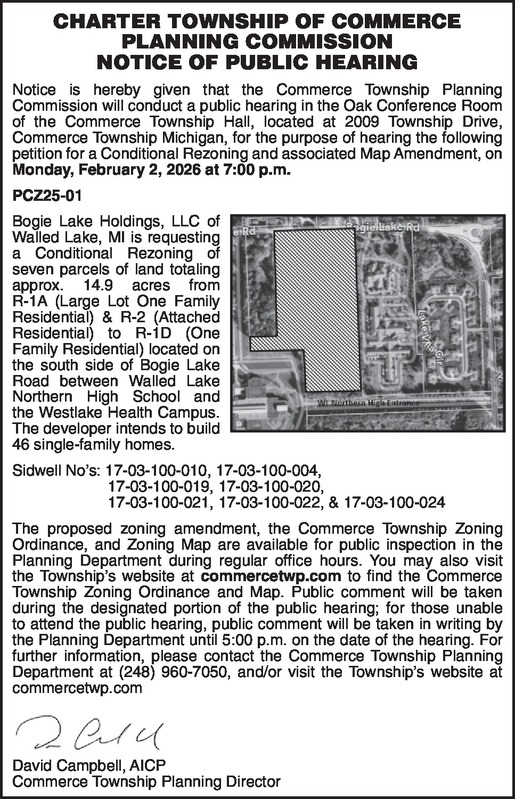CHARTER TOWNSHIP OF COMMERCE PLANNING COMMISSION NOTICE OF PUBLIC HEARING Notice is hereby given that the Commerce Township Planning Commission will conduct a public hearing in the Oak Conference Room of the Commerce Township Hall, located at 2009 Township Drive, Commerce Township Michigan, for the purpose of hearing the following petition for a Conditional Rezoning and associated Map Amendment, on Monday, February 2, 2026 at 7:00 p.m. PCZ25-01 Bogie Lake Holdings, LLC of Walled Lake, MI is requesting a Conditional Rezoning of seven parcels of land totaling approx. 14.9 acres from R-1A (Large Lot One Family Residential) & R-2 (Attached Residential) to R-1D (One Family Residential) located on the south side of Bogie Lake Road between Walled Lake Northern High School and the Westlake Health Campus. The developer intends to build 46 single-family homes. Sidwell No’s: 17-03-100-010, 17-03-100-004, 17-03-100-019, 17-03-100-020, 17-03-100-021, 17-03-100-022, & 17-03-100-024 The proposed zoning amendment, the Commerce Township Zoning Ordinance, and Zoning Map are available for public inspection in the Planning Department during regular office hours. You may also visit the Township’s website at commercetwp.com to find the Commerce Township Zoning Ordinance and Map. Public comment will be taken during the designated portion of the public hearing; for those unable to attend the public hearing, public comment will be taken in writing by the Planning Department until 5:00 p.m. on the date of the hearing. For further information, please contact the Commerce Township Planning Department at (248) 960-7050, and/or visit the Township’s website at commercetwp.com David Campbell, AICP Commerce Township Planning Director