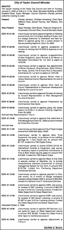 City of Taylor Council Minutes MINUTES The regular meeting of the Taylor City Council was held on Tuesday, January 6, 2026 at 5:28 p.m. in the Taylor Municipal Building at 23555 Goddard Road, Taylor, Michigan. Council Chairman Charley Johnson called the meeting to order. Present: Charley Johnson, Christian Armstrong, Chris Clark, Williams Patts, Gerald Thomas, Dan Wallace, Ron Thiede Also Present: Mayor Woolley, Clerk Bower, Treasurer Dragone Sr., Corporation Counsel Plato, Council Secretary Swain CCR: #1.01-26 Unanimously carried to approve Agenda w/ following amendments; Item 5.2 proper spelling of Aryka, Item 5.4 change Downriver to Downtown and Item 6.2 Motion to approve going into a closed session to discuss pending litigations, Claim QL-0926 CCR: #1.02-26 Unanimously carried to approve acceptance of minutes of meeting held 12/16/25 & dispense w/ oral reading CCR: #1.03-26 Unanimously carried to approve re-appointments of Sheri Engelbrink, Jason Broniak & Ed Warner to Recreation Commission for 1-yr term to expire on 12/31/26 CCR: #1.04-26 Unanimously carried to approve new appointments of Blaine Honeycutt, Greg Bersano, Dylan DiCicco, Ken Hasty, Cynthia Fell & Aryka Rice to Recreation Commission for 1-yr term to expire on 12/31/26 CCR: #1.05-26 Unanimously carried to approve William Patts to Library Board as Council Representative thru end of his term CCR: #1.06-26 Unanimously carried to approve Chris Clark as Council Representative to Downtown Development Authority thru end of his term CCR: #1.07-26 Unanimously carried to approve Christian Armstrong as Council Representative on Risk Management thru end of his term CCR: #1.08-26 Unanimously carried to approve Presentation by Commissioner Alex Garza CCR: #1.09-26 Unanimously carried to approve going into closed session at 6:47p.m. to discuss Pending Litigations, Claim QL-0926 Roll Call Vote Reconvened at 7:12 p.m CCR: #1.10-26 Unanimously carried to approve final settlement of Risk Management Claim QL- 0926 as recommended by Corporation Counsel. Roll Call Vote CCR: #1.11-26 Unanimously carried to approve City of Taylor budget amendment 2026-003 dated 1/6/26 CCR: #1.12-26 Unanimously carried to approve Abco Truck Equipment, low quote, for purchase of van outfitting package for 1 Ford Transit van, for amount NTE $7,197, funded thru TBA Capital Outlay CCR: #1.13-26 Unanimously carried to amend CCR#4.127-25 for International Controls & Equipment, sole source, for necessary repairs & preventive maintenance of Pine & Birch Street security gates for amount NTE $10,000. Funded thru TBA Capital Outlay CCR: #1.14-26 Unanimously carried to approve Mayor & City Clerk to execute contract w/ OpenGov, Inc. to provide comprehensive electronic procurement & contract management System for 3-yr term, in amount NTE $176,754. Funded thru Purchasing Department Contractual Services CCR: #1.15-26 Unanimously carried to approve payment to Onix, sole source, for 3 months of Google workspace licenses ending October 2025 in amount of $55,369, funded thru General Fund IT Contractual Services CCR: #1.16-26 Unanimously carried to approve ESRI, sole source, for renewal of GIS Licensing, in amount of $62,375 for year 3 of the 3-yr Licensing contract. Funded thru Water Department & Sewer Department CCR: #1.17-26 Unanimously carried to approve ESRI, sole source, for renewal of GIS Server Licensing, in amount of $7,087 for year 3 of 3-yr Licensing contract. Funded thru Water Department and Sewer Department. Interested Parties: C. Patts CCR: #1.18-26 Unanimously carried to approve BM Services LLC, low quote for repair on Water Department vehicle in amount NTE $4,082. Funded thru Water Fund & other repair & maintenance account CCR: #1.19-26 Unanimously carried to approve adjournment at 7:37 p.m. Cynthia A. Bower