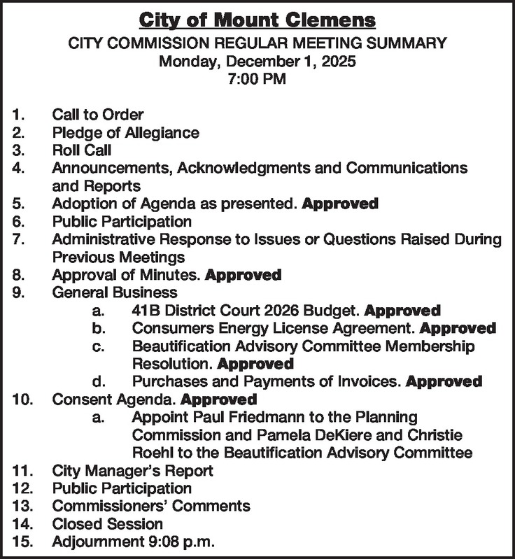 City of Mount Clemens CITY COMMISSION REGULAR MEETING SUMMARY Monday, December 1, 2025 7:00 PM 1. Call to Order 2. Pledge of Allegiance 3. Roll Call 4. Announcements, Acknowledgments and Communications and Reports 5. Adoption of Agenda as presented. Approved 6. Public Participation 7. Administrative Response to Issues or Questions Raised During Previous Meetings 8. Approval of Minutes. Approved 9. General Business a. 41B District Court 2026 Budget. Approved b. Consumers Energy License Agreement. Approved c. Beautification Advisory Committee Membership Resolution. Approved d. Purchases and Payments of Invoices. Approved 10. Consent Agenda. Approved a. Appoint Paul Friedmann to the Planning Commission and Pamela DeKiere and Christie Roehl to the Beautification Advisory Committee 11. City Manager’s Report 12. Public Participation 13. Commissioners’ Comments 14. Closed Session 15. Adjournment 9:08 p.m.