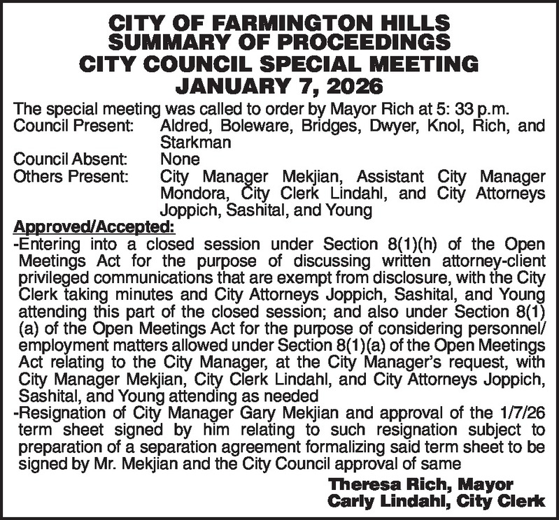 CITY OF FARMINGTON HILLS SUMMARY OF PROCEEDINGS CITY COUNCIL SPECIAL MEETING JANUARY 7, 2026 The special meeting was called to order by Mayor Rich at 5: 33 p.m. Council Present: Aldred, Boleware, Bridges, Dwyer, Knol, Rich, and Starkman Council Absent: None Others Present: City Manager Mekjian, Assistant City Manager Mondora, City Clerk Lindahl, and City Attorneys Joppich, Sashital, and Young Approved/Accepted: -Entering into a closed session under Section 8(1)(h) of the Open Meetings Act for the purpose of discussing written attorney-client privileged communications that are exempt from disclosure, with the City Clerk taking minutes and City Attorneys Joppich, Sashital, and Young attending this part of the closed session; and also under Section 8(1)(a) of the Open Meetings Act for the purpose of considering personnel/employment matters allowed under Section 8(1)(a) of the Open Meetings Act relating to the City Manager, at the City Manager’s request, with City Manager Mekjian, City Clerk Lindahl, and City Attorneys Joppich, Sashital, and Young attending as needed -Resignation of City Manager Gary Mekjian and approval of the 1/7/26 term sheet signed by him relating to such resignation subject to preparation of a separation agreement formalizing said term sheet to be signed by Mr. Mekjian and the City Council approval of same Theresa Rich, Mayor Carly Lindahl, City Clerk