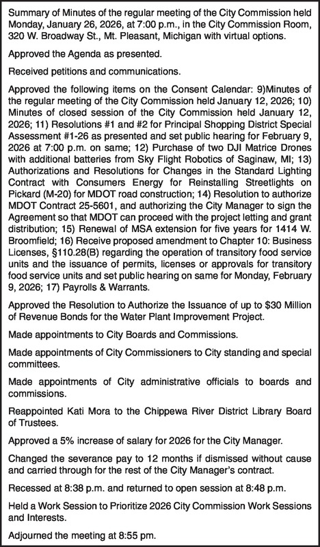 Summary of Minutes of the regular meeting of the City Commission held Monday, January 26, 2026, at 7:00 p.m., in the City Commission Room, 320 W. Broadway St., Mt. Pleasant, Michigan with virtual options. Approved the Agenda as presented. Received petitions and communications. Approved the following items on the Consent Calendar: 9)Minutes of the regular meeting of the City Commission held January 12, 2026; 10) Minutes of closed session of the City Commission held January 12, 2026; 11) Resolutions #1 and #2 for Principal Shopping District Special Assessment #1-26 as presented and set public hearing for February 9, 2026 at 7:00 p.m. on same; 12) Purchase of two DJI Matrice Drones with additional batteries from Sky Flight Robotics of Saginaw, MI; 13) Authorizations and Resolutions for Changes in the Standard Lighting Contract with Consumers Energy for Reinstalling Streetlights on Pickard (M-20) for MDOT road construction; 14) Resolution to authorize MDOT Contract 25-5601, and authorizing the City Manager to sign the Agreement so that MDOT can proceed with the project letting and grant distribution; 15) Renewal of MSA extension for five years for 1414 W. Broomfield; 16) Receive proposed amendment to Chapter 10: Business Licenses, §110.28(B) regarding the operation of transitory food service units and the issuance of permits, licenses or approvals for transitory food service units and set public hearing on same for Monday, February 9, 2026; 17) Payrolls & Warrants. Approved the Resolution to Authorize the Issuance of up to $30 Million of Revenue Bonds for the Water Plant Improvement Project. Made appointments to City Boards and Commissions. Made appointments of City Commissioners to City standing and special committees. Made appointments of City administrative officials to boards and commissions. Reappointed Kati Mora to the Chippewa River District Library Board of Trustees. Approved a 5% increase of salary for 2026 for the City Manager. Changed the severance pay to 12 months if dismissed without cause and carried through for the rest of the City Manager’s contract. Recessed at 8:38 p.m. and returned to open session at 8:48 p.m. Held a Work Session to Prioritize 2026 City Commission Work Sessions and Interests. Adjourned the meeting at 8:55 pm.