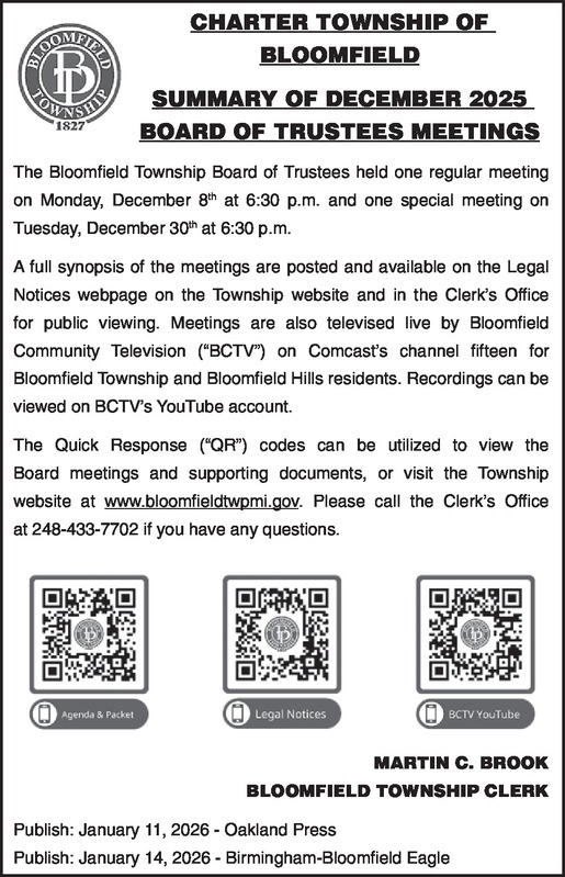 CHARTER TOWNSHIP OF BLOOMFIELD SUMMARY OF DECEMBER 2025 BOARD OF TRUSTEES MEETINGS The Bloomfield Township Board of Trustees held one regular meeting on Monday, December 8th at 6:30 p.m. and one special meeting on Tuesday, December 30th at 6:30 p.m. A full synopsis of the meetings are posted and available on the Legal Notices webpage on the Township website and in the Clerk’s Office for public viewing. Meetings are also televised live by Bloomfield Community Television (“BCTV”) on Comcast’s channel fifteen for Bloomfield Township and Bloomfield Hills residents. Recordings can be viewed on BCTV’s YouTube account. The Quick Response (“QR”) codes can be utilized to view the Board meetings and supporting documents, or visit the Township website at www.bloomfieldtwpmi.gov. Please call the Clerk’s Office at 248-433-7702 if you have any questions. MARTIN C. BROOK BLOOMFIELD TOWNSHIP CLERK Publish: January 11, 2026 - Oakland Press Publish: January 14, 2026 - Birmingham-Bloomfield Eagle