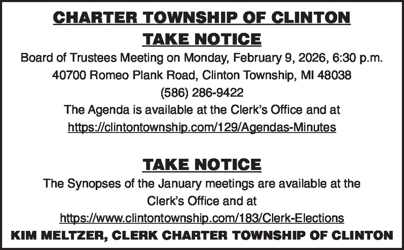 CHARTER TOWNSHIP OF CLINTON TAKE NOTICE Board of Trustees Meeting on Monday, February 9, 2026, 6:30 p.m. 40700 Romeo Plank Road, Clinton Township, MI 48038 (586) 286-9422 The Agenda is available at the Clerk’s Office and at https://clintontownship.com/129/Agendas-Minutes TAKE NOTICE The Synopses of the January meetings are available at the Clerk’s Office and at https://www.clintontownship.com/183/Clerk-Elections KIM MELTZER, CLERK CHARTER TOWNSHIP OF CLINTON