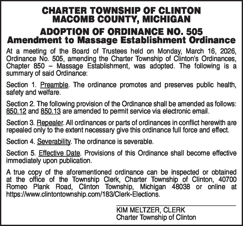 CHARTER TOWNSHIP OF CLINTON MACOMB COUNTY, MICHIGAN ADOPTION OF ORDINANCE NO. 505 Amendment to Massage Establishment Ordinance At a meeting of the Board of Trustees held on Monday, March 16, 2026, Ordinance No. 505, amending the Charter Township of Clinton’s Ordinances, Chapter 850 – Massage Establishment, was adopted. The following is a summary of said Ordinance: Section 1. Preamble. The ordinance promotes and preserves public health, safety and welfare. Section 2. The following provision of the Ordinance shall be amended as follows: 850.12 and 850.13 are amended to permit service via electronic email. Section 3. Repealer. All ordinances or parts of ordinances in conflict herewith are repealed only to the extent necessary give this ordinance full force and effect. Section 4. Severability. The ordinance is severable. Section 5. Effective Date. Provisions of this Ordinance shall become effective immediately upon publication. A true copy of the aforementioned ordinance can be inspected or obtained at the office of the Township Clerk, Charter Township of Clinton, 40700 Romeo Plank Road, Clinton Township, Michigan 48038 or online at https://www.clintontownship.com/183/Clerk-Elections. _________________________________ KIM MELTZER, CLERK Charter Township of Clinton