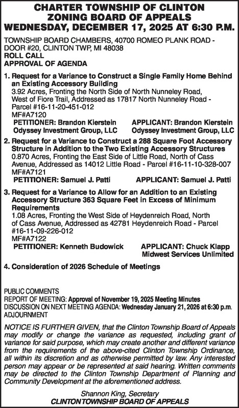CHARTER TOWNSHIP OF CLINTON ZONING BOARD OF APPEALS WEDNESDAY, DECEMBER 17, 2025 AT 6:30 P.M. TOWNSHIP BOARD CHAMBERS, 40700 ROMEO PLANK ROAD - DOOR #20, CLINTON TWP, MI 48038 ROLL CALL APPROVAL OF AGENDA 1. Request for a Variance to Construct a Single Family Home Behind an Existing Accessory Building 3.92 Acres, Fronting the North Side of North Nunneley Road, West of Fiore Trail, Addressed as 17817 North Nunneley Road - Parcel #16-11-20-451-012 MF#A7120 PETITIONER: Brandon Kierstein APPLICANT: Brandon Kierstein Odyssey Investment Group, LLC Odyssey Investment Group, LLC 2. Request for a Variance to Construct a 288 Square Foot Accessory Structure in Addition to the Two Existing Accessory Structures 0.870 Acres, Fronting the East Side of Little Road, North of Cass Avenue, Addressed as 14012 Little Road - Parcel #16-11-10-328-007 MF#A7121 PETITIONER: Samuel J. Patti APPLICANT: Samuel J. Patti 3. Request for a Variance to Allow for an Addition to an Existing Accessory Structure 363 Square Feet in Excess of Minimum Requirements 1.08 Acres, Fronting the West Side of Heydenreich Road, North of Cass Avenue, Addressed as 42781 Heydenreich Road - Parcel #16-11-09-226-012 MF#A7122 PETITIONER: Kenneth Budowick APPLICANT: Chuck Klapp Midwest Services Unlimited 4. Consideration of 2026 Schedule of Meetings PUBLIC COMMENTS REPORT OF MEETING: Approval of November 19, 2025 Meeting Minutes DISCUSSION ON NEXT MEETING AGENDA: Wednesday January 21, 2026 at 6:30 p.m. ADJOURNMENT NOTICE IS FURTHER GIVEN, that the Clinton Township Board of Appeals may modify or change the variance as requested, including grant of variance for said purpose, which may create another and different variance from the requirements of the above-cited Clinton Township Ordinance, all within its discretion and as otherwise permitted by law. Any interested person may appear or be represented at said hearing. Written comments may be directed to the Clinton Township Department of Planning and Community Development at the aforementioned address. Shannon King, Secretary CLINTON TOWNSHIP BOARD OF APPEALS