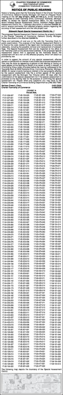 CHARTER TOWNSHIP OF COMMERCE 2009 TOWNSHIP DRIVE COMMERCE TOWNSHIP, MI 48390 NOTICE OF PUBLIC HEARING Notice is hereby given that the Township Board of the Charter Township of Commerce, Oakland County, Michigan, will meet at a Regular Board meeting on the 14 th day of April, 2026, at 7:00 p.m., at the Township Hall, located at 2009 Township Drive, Commerce Township, Michigan 48390, to review the Special Assessment ROLL for the Township Board initiated Special Assessment District, Sidewalk Repair Special Assessment District No. 1 (detailed description in attached Exhibit A), and to receive comments from affected property owners regarding the accuracy of their assessment and the total project cost. Sidewalk Repair Special Assessment District No. 1 The proposed Special Assessment District involves the property located in the Charter Township of Commerce, Oakland County, Michigan, further described in the attached Exhibit A. Plans and estimates of cost are on file with the Township Clerk for public examination. The purpose of the Special Assessment District is to finance the costs related to the repair and maintenance of concrete sidewalks, including the possible removal and replacement of sidewalk flags. The Special Assessment Roll can be inspected at the office of the Township Clerk at the above-listed address. If the proposed Special Assessment District Roll is approved by the Township Board, the assessment will be a lien on the affected property, which will attach as provided by law. In order to appeal the amount of any special assessment, affected owners or parties with an interest must protest the proposed assessment. This may be done by appearing in person at the hearing or having an agent appear at the hearing on behalf of an owner or party in interest, or in writing by filing a letter of protest before the hearing, addressed to the Township Clerk at 2009 Township Drive, Commerce Township, Michigan 48390. An owner or party having an interest in the real property affected by the special assessment may file a written appeal of the special assessment with the Michigan Tax Tribunal within 30 days after the confirmation of the special assessment roll if the special assessment is protested at the hearing held for the purpose of confirming the special assessment roll. Please direct any questions you may have to the Charter Township of Commerce Building Department at (248) 960-7060. Melissa Creech, Clerk 04/01/2026 Charter Township of Commerce 04/08/2026 EXHIBIT A Parcel Nos. 17-01-209-007 17-01-327-001 17-01-327-003 17-01-328-009 17-01-328-011 17-01-328-014 17-01-328-018 17-01-328-021 17-01-402-003 17-01-402-007 17-01-402-008 17-01-402-017 17-01-402-018 17-01-402-024 17-01-402-025 17-01-402-027 17-01-402-029 17-01-402-030 17-01-403-004 17-01-403-008 17-01-403-009 17-02-208-001 17-02-208-003 17-02-208-004 17-02-208-008 17-02-208-014 17-02-208-022 17-02-208-028 17-02-208-029 17-02-208-037 17-04-226-002 17-04-226-006 17-04-226-013 17-04-226-014 17-04-226-018 17-04-226-019 17-04-226-020 17-04-226-026 17-04-226-028 17-04-226-029 17-04-226-031 17-04-226-039 17-04-226-041 17-04-226-044 17-04-226-046 17-04-226-048 17-04-226-051 17-04-226-054 17-04-226-058 17-04-226-059 17-04-226-062 17-04-226-063 17-04-226-064 17-04-226-065 17-04-226-067 17-04-226-068 17-04-226-069 17-04-226-070 17-04-226-071 17-04-226-074 17-04-226-076 17-04-226-077 17-04-226-079 17-04-226-080 17-04-226-082 17-04-226-086 17-04-226-087 17-04-226-090 17-04-226-094 17-04-226-108 17-04-226-113 17-04-226-117 17-04-226-121 17-04-226-130 17-04-226-131 17-04-226-141 17-04-226-142 17-04-226-171 17-04-226-172 17-04-226-173 17-04-226-174 17-04-226-182 17-04-226-185 17-04-226-187 17-04-226-203 17-04-226-243 17-04-226-269 17-04-226-295 17-04-403-001 17-04-403-002 17-04-403-003 17-04-403-007 17-04-403-010 17-04-403-013 17-04-403-016 17-05-100-026 17-05-126-001 17-05-126-002 17-05-126-003 17-05-126-004 17-05-126-005 17-05-126-006 17-05-126-007 17-05-126-008 17-05-126-011 17-05-126-012 17-05-126-014 17-05-126-015 17-05-126-016 17-05-126-019 17-05-126-020 17-05-126-022 17-05-126-023 17-05-126-024 17-05-126-026 17-05-126-028 17-05-126-031 17-05-126-032 17-05-127-001 17-05-127-002 17-05-128-002 17-05-128-003 17-05-128-004 17-05-128-005 17-05-129-005 17-05-129-006 17-05-130-002 17-05-130-003 17-05-130-004 17-05-177-001 17-05-177-003 17-05-177-005 17-05-177-009 17-05-177-010 17-05-177-011 17-05-201-001 17-05-201-003 17-05-201-004 17-05-201-007 17-05-201-009 17-05-201-011 17-05-201-012 17-05-201-013 17-05-201-014 17-05-202-001 17-05-202-002 17-05-202-005 17-05-202-006 17-05-202-008 17-05-202-009 17-05-202-010 17-05-202-011 17-05-202-012 17-05-202-013 17-05-202-014 17-05-202-016 17-05-202-017 17-05-202-018 17-05-202-019 17-05-202-020 17-05-202-021 17-05-202-023 17-05-202-025 17-05-202-026 17-05-202-027 17-05-202-028 17-05-202-029 17-05-202-030 17-05-202-032 17-05-202-033 17-05-203-003 17-05-203-004 17-05-203-005 17-05-203-006 17-05-203-007 17-05-203-008 17-05-203-009 17-05-203-010 17-05-203-011 17-05-203-012 17-05-203-013 17-05-203-015 17-05-203-016 17-05-203-019 17-05-203-020 17-05-203-021 17-05-203-022 17-05-203-024 17-05-251-002 17-05-251-003 17-05-251-007 17-05-251-009 17-05-251-010 17-05-252-001 17-05-252-002 Sidewalk Repair Special Assessment District No. 1 Exhibit A Page 3 17-05-252-003 17-05-252-004 17-05-252-005 17-05-252-007 17-05-252-009 17-05-252-010 17-05-252-011 17-05-252-012 17-05-252-013 17-05-253-003 17-05-253-005 17-05-253-006 17-05-253-008 17-05-301-001 17-05-301-002 17-05-302-001 17-05-302-012 17-05-302-015 17-05-302-016 17-05-302-017 17-05-302-018 17-05-302-020 17-05-302-021 17-05-302-022 17-05-302-026 17-05-351-001 17-05-351-002 17-05-351-004 17-05-351-005 17-05-351-006 17-05-351-008 17-05-351-012 17-05-351-013 17-05-351-017 17-05-351-020 17-05-351-021 17-05-351-025 17-05-352-002 17-05-352-003 17-05-352-004 17-05-352-011 17-05-352-012 17-05-352-015 17-05-352-018 17-05-352-023 17-05-401-007 17-05-476-001 17-05-476-002 17-05-476-003 