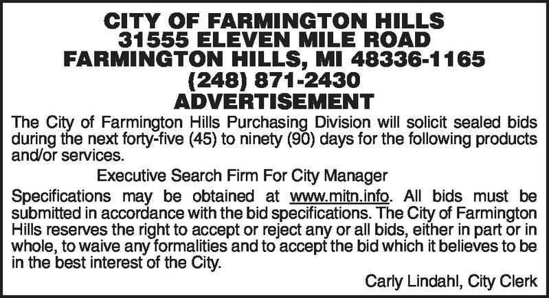 CITY OF FARMINGTON HILLS 31555 ELEVEN MILE ROAD FARMINGTON HILLS, MI 48336-1165 (248) 871-2430 ADVERTISEMENT The City of Farmington Hills Purchasing Division will solicit sealed bids during the next forty-five (45) to ninety (90) days for the following products and/or services. Executive Search Firm For City Manager Specifications may be obtained at www.mitn.info . All bids must be submitted in accordance with the bid specifications. The City of Farmington Hills reserves the right to accept or reject any or all bids, either in part or in whole, to waive any formalities and to accept the bid which it believes to be in the best interest of the City. Carly Lindahl, City Clerk