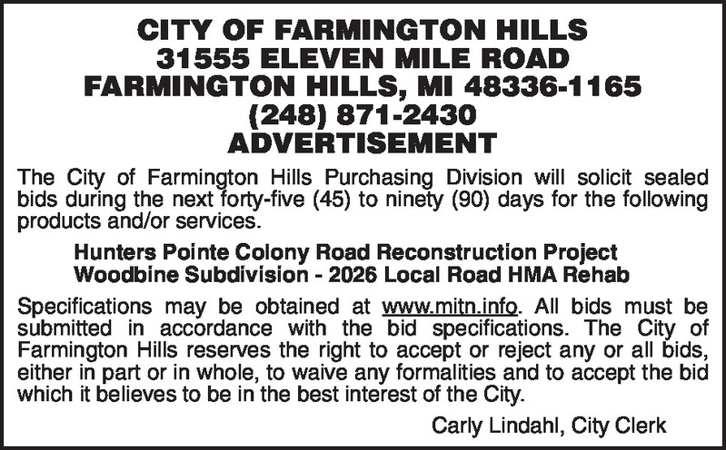 CITY OF FARMINGTON HILLS 31555 ELEVEN MILE ROAD FARMINGTON HILLS, MI 48336-1165 (248) 871-2430 ADVERTISEMENT The City of Farmington Hills Purchasing Division will solicit sealed bids during the next forty-five (45) to ninety (90) days for the following products and/or services. Hunters Pointe Colony Road Reconstruction Project Woodbine Subdivision - 2026 Local Road HMA Rehab Specifications may be obtained at www.mitn.info . All bids must be submitted in accordance with the bid specifications. The City of Farmington Hills reserves the right to accept or reject any or all bids, either in part or in whole, to waive any formalities and to accept the bid which it believes to be in the best interest of the City. Carly Lindahl, City Clerk
