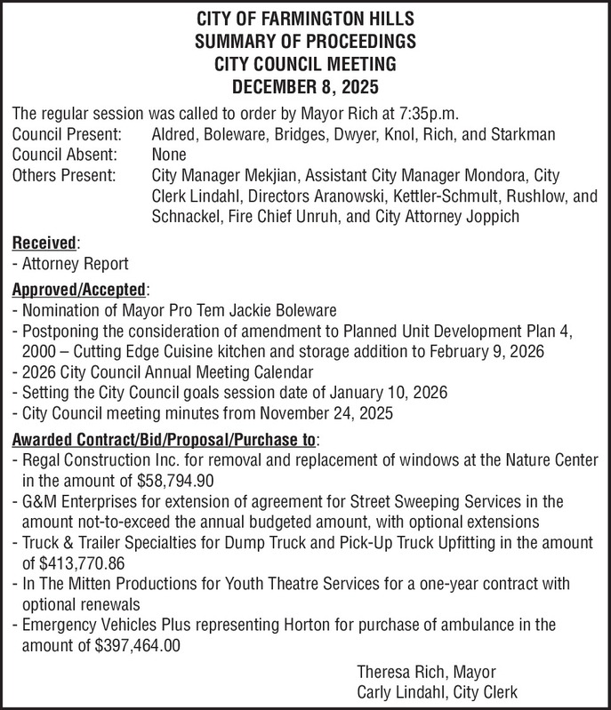 CITY OF FARMINGTON HILLS SUMMARY OF PROCEEDINGS CITY COUNCIL MEETING DECEMBER 8, 2025 The regular session was called to order by Mayor Rich at 7:35p.m. Council Present: Aldred, Boleware, Bridges, Dwyer, Knol, Rich, and Starkman Council Absent: None Others Present: City Manager Mekjian, Assistant City Manager Mondora, City Clerk Lindahl, Directors Aranowski, Kettler-Schmult, Rushlow, and Schnackel, Fire Chief Unruh, and City Attorney Joppich Received: -Attorney Report Approved/Accepted: -Nomination of Mayor Pro Tem Jackie Boleware -Postponing the consideration of amendment to Planned Unit Development Plan 4, 2000 – Cutting Edge Cuisine kitchen and storage addition to February 9, 2026 -2026 City Council Annual Meeting Calendar -Setting the City Council goals session date of January 10, 2026 -City Council meeting minutes from November 24, 2025 Awarded Contract/Bid/Proposal/Purchase to: -Regal Construction Inc. for removal and replacement of windows at the Nature Center in the amount of $58,794.90 -G&M Enterprises for extension of agreement for Street Sweeping Services in the amount not-to-exceed the annual budgeted amount, with optional extensions -Truck & Trailer Specialties for Dump Truck and Pick-Up Truck Upfitting in the amount of $413,770.86 -In The Mitten Productions for Youth Theatre Services for a one-year contract with optional renewals -Emergency Vehicles Plus representing Horton for purchase of ambulance in the amount of $397,464.00 Theresa Rich, Mayor Carly Lindahl, City Clerk