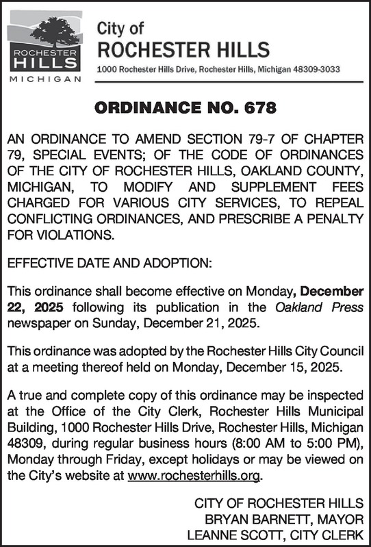 CITY OF ROCHESTER HILLS ORDINANCE NO. 678 AN ORDINANCE TO AMEND SECTION 79-7 OF CHAPTER 79, SPECIAL EVENTS; OF THE CODE OF ORDINANCES OF THE CITY OF ROCHESTER HILLS, OAKLAND COUNTY, MICHIGAN, TO MODIFY AND SUPPLEMENT FEES CHARGED FOR VARIOUS CITY SERVICES, TO REPEAL CONFLICTING ORDINANCES, AND PRESCRIBE A PENALTY FOR VIOLATIONS. EFFECTIVE DATE AND ADOPTION: This ordinance shall become effective on Monday, December 22, 2025 following its publication in the Oakland Press newspaper on Sunday, December 21, 2025. This ordinance was adopted by the Rochester Hills City Council at a meeting thereof held on Monday, December 15, 2025. A true and complete copy of this ordinance may be inspected at the Office of the City Clerk, Rochester Hills Municipal Building, 1000 Rochester Hills Drive, Rochester Hills, Michigan 48309, during regular business hours (8:00 AM to 5:00 PM), Monday through Friday, except holidays or may be viewed on the City’s website at www.rochesterhills.org. CITY OF ROCHESTER HILLS BRYAN BARNETT, MAYOR LEANNE SCOTT, CITY CLERK