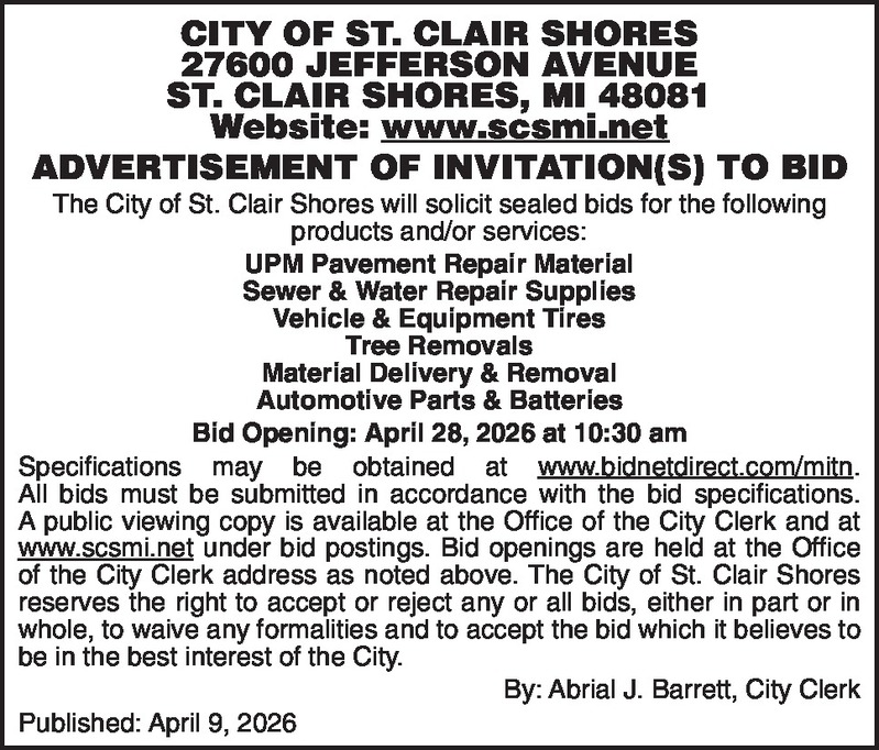 CITY OF ST. CLAIR SHORES 27600 JEFFERSON AVENUE ST. CLAIR SHORES, MI 48081 Website: www.scsmi.net ADVERTISEMENT OF INVITATION(S) TO BID The City of St. Clair Shores will solicit sealed bids for the following products and/or services: UPM Pavement Repair Material Sewer & Water Repair Supplies Vehicle & Equipment Tires Tree Removals Material Delivery & Removal Automotive Parts & Batteries Bid Opening: April 28, 2026 at 10:30 am Specifications may be obtained at www.bidnetdirect.com/mitn. All bids must be submitted in accordance with the bid specifications. A public viewing copy is available at the Office of the City Clerk and at www.scsmi.net under bid postings. Bid openings are held at the Office of the City Clerk address as noted above. The City of St. Clair Shores reserves the right to accept or reject any or all bids, either in part or in whole, to waive any formalities and to accept the bid which it believes to be in the best interest of the City. By: Abrial J. Barrett, City Clerk Published: April 9, 2026
