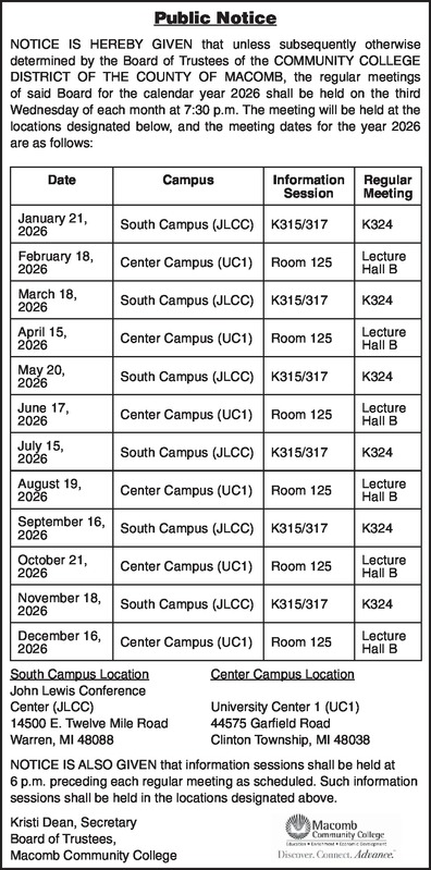 Public Notice NOTICE IS HEREBY GIVEN that unless subsequently otherwise determined by the Board of Trustees of the COMMUNITY COLLEGE DISTRICT OF THE COUNTY OF MACOMB, the regular meetings of said Board for the calendar year 2026 shall be held on the third Wednesday of each month at 7:30 p.m. The meeting will be held at the locations designated below, and the meeting dates for the year 2026 are as follows: Date Campus Information Session Regular Meeting January 21, 2026 South Campus (JLCC) K315/317 K324 February 18, 2026 Center Campus (UC1) Room 125 Lecture Hall B March 18, 2026 South Campus (JLCC) K315/317 K324 April 15, 2026 Center Campus (UC1) Room 125 Lecture Hall B May 20, 2026 South Campus (JLCC) K315/317 K324 June 17, 2026 Center Campus (UC1) Room 125 Lecture Hall B July 15, 2026 South Campus (JLCC) K315/317 K324 August 19, 2026 Center Campus (UC1) Room 125 Lecture Hall B September 16, 2026 South Campus (JLCC) K315/317 K324 October 21, 2026 Center Campus (UC1) Room 125 Lecture Hall B November 18, 2026 South Campus (JLCC) K315/317 K324 December 16, 2026 Center Campus (UC1) Room 125 Lecture Hall B South Campus Location Center Campus Location John Lewis Conference Center (JLCC) University Center 1 (UC1) 14500 E. Twelve Mile Road 44575 Garfield Road Warren, MI 48088 Clinton Township, MI 48038 NOTICE IS ALSO GIVEN that information sessions shall be held at 6 p.m. preceding each regular meeting as scheduled. Such information sessions shall be held in the locations designated above. Kristi Dean, Secretary Board of Trustees, Macomb Community College