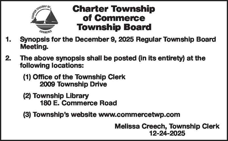 Charter Township of Commerce Township Board 1. Synopsis for the December 9, 2025 Regular Township Board Meeting. 2. The above synopsis shall be posted (in its entirety) at the following locations: (1) Office of the Township Clerk 2009 Township Drive (2) Township Library 180 E. Commerce Road (3) Township’s website www.commercetwp.com Melissa Creech, Township Clerk 12-24-2025