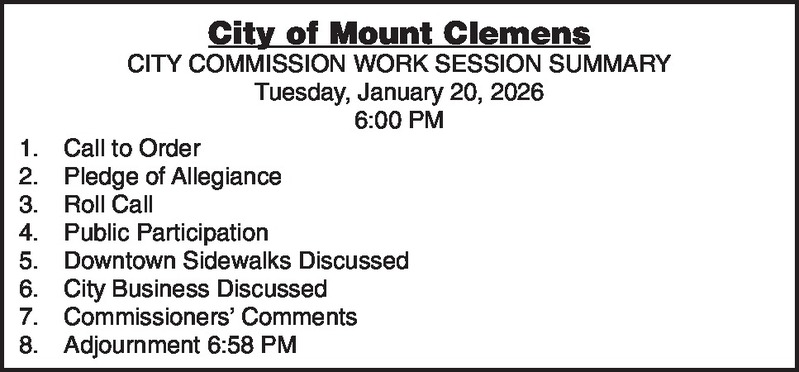City of Mount Clemens CITY COMMISSION WORK SESSION SUMMARY Tuesday, January 20, 2026 6:00 PM 1. Call to Order 2. Pledge of Allegiance 3. Roll Call 4. Public Participation 5. Downtown Sidewalks Discussed 6. City Business Discussed 7. Commissioners’ Comments 8. Adjournment 6:58 p.m.