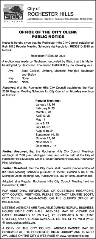 City of ROCHESTER HILLS 1000 Rochester Hills Drive, Rochester Hills, Michigan 48309-3033 ____________________________________________________________________________ OFFICE OF THE CITY CLERK PUBLIC NOTICE Notice is hereby given that the Rochester Hills City Council established their 2026 Regular Meeting Schedule via Resolution RES0310-2025 as follows: Resolution RES0310-2025 A motion was made by Neubauer, seconded by Blair, that this Matter be Adopted by Resolution. The motion CARRIED by the following vote: Aye: Blair, Carlock, Limberg, Mannino, Mungioli, Neubauer and Skelcy Nay: None Absent: None Resolved, that the Rochester Hills City Council establishes the Year 2026 Regular Meeting Schedule for City Council on Monday evenings as follows: Regular Meetings: January 12, 26 February 9, 23 March 9, 23 April 13, 27 May 11 June 8, 22 July 13, 27 August 10, 24 September 14, 28 October 12, 26 November 9 December 7, 14 Further Resolved, that the Rochester Hills City Council Meetings will begin at 7:00 p.m., Michigan Time, and will be held at the City of Rochester Hills Municipal Offices, 1000 Rochester Hills Drive, Rochester Hills, Michigan. Further Resolved, that the City Clerk shall provide proper notice of the 2026 Meeting Schedule pursuant to 15.265, Section 5 (3) of the Michigan Open Meetings Act, Public Act No. 267 of 1976, as amended. Adopted at a Regular Rochester Hills City Council Meeting held on December 1, 2025. FOR ADDITIONAL INFORMATION OR QUESTIONS REGARDING CITY COUNCIL MEETINGS, PLEASE CONTACT LEANNE SCOTT, CITY CLERK, AT 248-841-2460, OR THE CLERK’S OFFICE AT 248-656-4630. MEETING AGENDAS ARE AVAILABLE DURING NORMAL BUSINESS HOURS INSIDE CITY HALL. AGENDAS MAY BE VIEWED ON CABLE CHANNELS 10 (W.O.W.), 20 (COMCAST) & 99 (AT&T U-VERSE), AND ARE ALSO AVAILABLE ON THE CITY’S WEB PAGE @ www.rochesterhills.org. A COPY OF THE CITY COUNCIL AGENDA PACKET MAY BE REVIEWED AT THE ROCHESTER HILLS LIBRARY AND IS ALSO AVAILABLE ON THE CITY’S WEB PAGE @ www.rochesterhills.org.