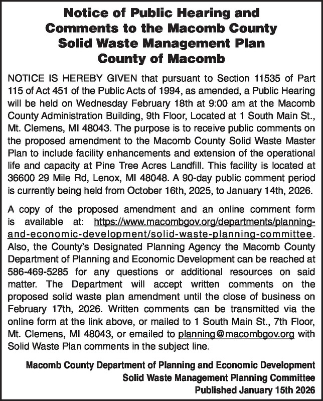 Notice of Public Hearing and Comments to the Macomb County Solid Waste Management Plan County of Macomb NOTICE IS HEREBY GIVEN that pursuant to Section 11535 of Part 115 of Act 451 of the Public Acts of 1994, as amended, a Public Hearing will be held on Wednesday February 18th at 9:00 am at the Macomb County Administration Building, 9th Floor, Located at 1 South Main St., Mt. Clemens, MI 48043. The purpose is to receive public comments on the proposed amendment to the Macomb County Solid Waste Master Plan to include facility enhancements and extension of the operational life and capacity at Pine Tree Acres Landfill. This facility is located at 36600 29 Mile Rd, Lenox, MI 48048. A 90-day public comment period is currently being held from October 16th, 2025, to January 14th, 2026. A copy of the proposed amendment and an online comment form is available at: https://www.macombgov.org/departments/planning-and-economic-development/solid-waste-planning-committee . Also, the County’s Designated Planning Agency the Macomb County Department of Planning and Economic Development can be reached at 586-469-5285 for any questions or additional resources on said matter. The Department will accept written comments on the proposed solid waste plan amendment until the close of business on February 17th, 2026. Written comments can be transmitted via the online form at the link above, or mailed to 1 South Main St., 7th Floor, Mt. Clemens, MI 48043, or emailed to planning@macombgov.org with Solid Waste Plan comments in the subject line. Macomb County Department of Planning and Economic Development Solid Waste Management Planning Committee Published January 15th 2026