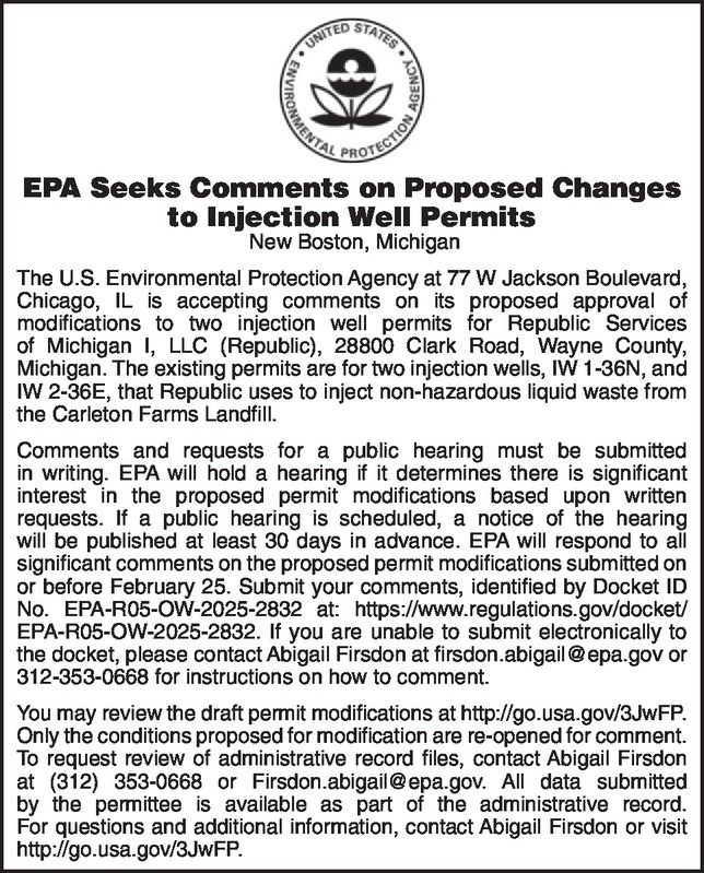 EPA Seeks Comments on Proposed Changes to Injection Well Permits New Boston, Michigan The U.S. Environmental Protection Agency at 77 W Jackson Boulevard, Chicago, IL is accepting comments on its proposed approval of modifications to two injection well permits for Republic Services of Michigan I, LLC (Republic), 28800 Clark Road, Wayne County, Michigan. The existing permits are for two injection wells, IW 1-36N, and IW 2-36E, that Republic uses to inject non-hazardous liquid waste from the Carleton Farms Landfill. Comments and requests for a public hearing must be submitted in writing. EPA will hold a hearing if it determines there is significant interest in the proposed permit modifications based upon written requests. If a public hearing is scheduled, a notice of the hearing will be published at least 30 days in advance. EPA will respond to all significant comments on the proposed permit modifications submitted on or before February 25. Submit your comments, identified by Docket ID No. EPA-R05-OW-2025-2832 at: https://www.regulations.gov/docket/EPA-R05-OW-2025-2832. If you are unable to submit electronically to the docket, please contact Abigail Firsdon at firsdon.abigail@epa.gov or 312-353-0668 for instructions on how to comment. You may review the draft permit modifications at http://go.usa.gov/3JwFP. Only the conditions proposed for modification are re-opened for comment. To request review of administrative record files, contact Abigail Firsdon at (312) 353-0668 or Firsdon.abigail@epa.gov. All data submitted by the permittee is available as part of the administrative record. For questions and additional information, contact Abigail Firsdon or visit http://go.usa.gov/3JwFP.