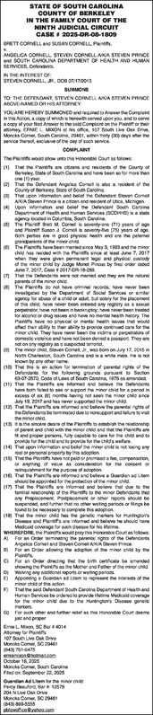 STATE OF SOUTH CAROLINA COUNTY OF BERKELEY IN THE FAMILY COURT OF THE NINTH JUDICIAL CIRCUIT CASE # 2025-DR-08-1809 BRETT CORNELL and SUSAN CORNELL, Plaintiffs, v. ANGELICA CORNELL, STEVEN CORNELL A/K/A STEVEN PRINCE and SOUTH CAROLINA DEPARTMENT OF HEALTH AND HUMAN SERVICES, Defendants. IN THE INTEREST OF: STEVEN CORNELL, JR., DOB 07/17/2015 SUMMONS TO: THE DEFENDANT, STEVEN CORNELL A/K/A STEVEN PRINCE ABOVE-NAMED OR HIS ATTORNEY: YOU ARE HEREBY SUMMONED and required to Answer the Complaint in this Action, a copy of which is herewith served upon you, and to serve a copy of your filed Answer to the said Complaint on the Plaintiff or their attorney, ERNIE L. MIXON at his office, 107 South Live Oak Drive, Moncks Corner, South Carolina, 29461, within thirty (30) days after the service thereof, exclusive of the day of such service. COMPLAINT The Plaintiffs would show unto this Honorable Court as follows: (1) That the Plaintiffs are citizens and residents of the County of Berkeley, State of South Carolina and have been so for more than one (1) year. (2) That the Defendant Angelica Cornell is also a resident of the County of Berkeley, State of South Carolina. (3) That upon information and belief the Defendant Steven Cornell A/K/A Steven Prince is a citizen and resident of Utica, Michigan. (4) Upon information and belief the Defendant South Carolina Department of Health and Human Services (SCDHHS) is a state agency located in Columbia, South Carolina. (5) The Plaintiff Brett M. Cornell is seventy-one (71) years of age and Plaintiff Susan J. Cornell is seventy-five (75) years of age. Both parties are in good physical health and are the paternal grandparents of the minor child. (6) The Plaintiffs have been married since May 3, 1983 and the minor child has resided with the Plaintiffs since at least June 7, 2017 when they were given permanent legal and physical custody of the minor child by Judge Monet Pincus by final order dated June 7, 2017, Case # 2017-DR-18-288. (7) That the Defendants were not married and they are the natural parents of the minor child. (8) The Plaintiffs do not have criminal records; have never been investigated by the Department of Social Services or similar agency for abuse of a child or adult, but solely for the placement of this child; have never been entered any registry as a sexual perpetrator, have not been in bankruptcy; have never been treated for alcohol or drug issues and have no mental health history. The Plaintiffs have no physical or mental health issues that would affect their ability to their ability to provide continued care for the minor child. They have never been the victims or perpetrators of domestic violence and have not been denied a passport. They are not on any registry as a suspected terrorist. (9) The minor child, Steven Cornell, Jr., was born on July 17, 2015 in North Charleston, South Carolina and is a white male. He is not known by any other name. (10) That this is an action for termination of parental rights of the Defendants for the following grounds pursuant to Section 63-07-2570, Code of Laws of South Carolina, 1976 as amended. (11) That the Plaintiffs are informed and believe the Defendants have both failed to see or support the minor child for a period in excess of six (6) months having not seen the minor child since July 19, 2017 and has never supported the minor child. (12) That the Plaintiffs are informed and believe the parental rights of the Defendants be terminated due to nonsupport and failure to visit the minor child. (13) It is the sincere desire of the Plaintiffs to establish the relationship of parent and child with the minor child and that the Plaintiffs are fit and proper persons, fully capable to care for the child and to provide for the child and to provide for the child’s welfare. (14) That upon information and belief the minor child is not losing any real or personal property by this adoption. (15) That the Plaintiffs have not paid or promised a fee, compensation, or anything of value as consideration for the consent or relinquishment for the purpose of adoption. (16) That the Plaintiffs are informed and believe a Guardian ad Litem should be appointed for the protection of the minor child. (17) That the Plaintiffs are informed and believe that due to the familial relationship of the Plaintiffs to the minor Defendants that any Preplacement, Postplacement or other reports should be suspended, and further that no other waiting periods or filings be found to be necessary to complete this adoption. (18) That the minor child has the genetic markers for Huntington’s Disease and Plaintiff’s are informed and believe he should have Medicaid coverage for such disease for his lifetime. WHEREFORE, the Plaintiffs would pray this Honorable Court as follows: A) For an Order terminating the parental rights of the Defendants Angelica Cornell and Steven Cornell A/K/A Steven Prince. B) For an Order allowing the adoption of the minor child by the Plaintiffs. C) For an Order directing that the birth certificate be amended showing the Plaintiffs as the Mother and Father of the minor child. D) Waiving any additional reports or waiting periods. E) Appointing a Guardian ad Litem to represent the interests of the minor child of this action. F) That the said Defendant South Carolina Department of Health and Human Services be ordered to provide lifetime Medicaid coverage for the minor child due to the Huntington’s Disease genetic markers. G) For such other and further relief as this Honorable Court deems just and proper. Ernie L. Mixon, SC Bar # 4014 Attorney for Plaintiffs 107 South Live Oak Drive Moncks Corner, SC 29461 (843) 761-6475 erniemixon@hotmail.com October 16, 2025 Moncks Corner, South Carolina Filed on: September 22, 2025 Guardian Ad Litem for the minor child: Percy Beauford, Bar #: 12578 204 N Live Oak Drive Moncks Corner, SC 29461 (843) 899-5555 pblawoffice@yahoo.com