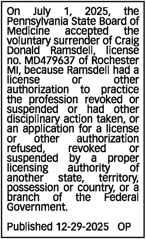 On July 1, 2025, the Pennsylvania State Board of Medicine accepted the voluntary surrender of Craig Donald Ramsdell, license no. MD479637 of Rochester MI, because Ramsdell had a license or other authorization to practice the profession revoked or suspended or had other disciplinary action taken, or an application for a license or other authorization refused, revoked or suspended by a proper licensing authority of another state, territory, possession or country, or a branch of the Federal Government. Published 12-29-2025 OP