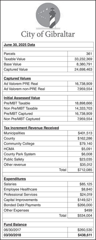 June 30, 2023 Data Parcels 361 Taxable Value 28,805,518 Base Value 8,380,791 Captured Value 20,424,727 Captured Values Ad Valorem PRE Real 13,988,058 Ad Valorem non-PRE Real 6,436,669 Initial Assessed Value Pre/MBT Taxable 15,986,790 Non Pre/MBT Taxable 12,818,728 Pre/MBT Captured 15,901,025 Non Pre/MBT Captured 12,904,493 Tax Increment Revenue Received Municipalities $332,506 County $134,653 Community College $65,770 HCMA $4,227 County Park System $4,986 Public Safety $19,112 Other revenue $9,958 Total $571,212 Expenditures Salaries $71,177 Employee Healthcare $7,625 Professional Services $28,279 Capital Improvements $186,004 Water Main Line $77,214 Bonded Debt Payments $270,863 Other Expenses $250 Total $641,411 Fund Balance 6/30/2022 $234,266 6/30/2023 $164,067