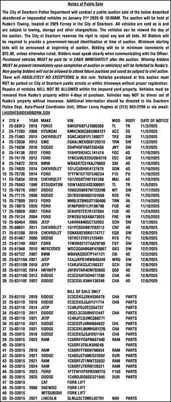 Notice of Public Sale The City of Dearborn Police Department will conduct a public auction sale of the below described abandoned or impounded vehicles on January 21 st 2026 @ 10:00AM. The auction will be held at Rusko’s Towing, located at 2929 Ferney in the City of Dearborn. All vehicles are sold as is and are subject to towing, storage and other charges/fees. The vehicles can be viewed the day of the auction. The City of Dearborn reserves the right to reject any and all bids. All Bidders will be required to provide a government-issued identification at time of auction. Minimum starting bids will be announced at beginning of auction. Bidding will be in minimum increments of $25.00, unless otherwise noted. Bidders must speak clearly when communicating with the Officer. Purchased vehicles MUST be paid for in CASH IMMEDIATELY after the auction. Winning bidders MUST be present immediately upon completion of auction or vehicle(s) will be forfeited to Rusko’s. Non-paying bidders will not be allowed to attend future auctions and could be subject to civil action. There will ABSOLUTELY NO EXCEPTIONS to this rule. Vehicles purchased at this auction must NOT be parked on City of Dearborn public streets or within driveways without proper registration. Repairs of vehicles WILL NOT BE ALLOWED within the impound yard property. Vehicles must be removed from Rusko’s property within 4-days of purchase. Vehicles may NOT be driven out of Rusko’s property without insurance. Additional information should be directed to the Dearborn Police Dept. Auto-Pound Coordinator Unit, Officer Lenny Hughes at (313) 943-2259 or via email: LHUGHES@DEARBORN.GOV # CFS # YEA R MAKE VIN MOD BODY DATE OF NOTICE 1 25-58913 2018 FORCE 5NHUFA921J1006568 TL TR 11/3/2025 2 25-71293 2008 HYUNDAI KMHCN36C88U066121 ACC 2D 11/3/2025 3 25-72463 2015 CHEVROLET 3GNCJKSB1FL180077 TRX SW 11/3/2025 4 25-73030 2013 GMC 2GKALMEK0D6120315 TRN SW 11/3/2025 5 25-74038 2010 DODGE 3D4PH5FV8AT265456 JNY SW 11/3/2025 6 25-74136 2012 FORD 1FAHP3H24CL141474 FOC 4D 11/10/2025 7 25-74179 2013 FORD 1FMCU9GX2DUD84219 ESC SW 11/10/2025 8 25-74872 2019 BMW WBA5R7C51KAJ79803 330 4D 11/10/2025 9 25-74920 2014 CHEVROLET 1G1JC5SH9E4137670 SON 4D 11/10/2025 10 25-75726 2014 FORD 1FTFW1EF7EFC49234 F15 PU 11/10/2025 11 25-75834 2019 CHEVROLET 1G1ZD5ST2KF181398 MAL 4D 11/10/2025 12 25-75983 1999 STOUGHTON 1DW1A5324XS300001 TL TR 11/5/2025 13 25-76276 2007 DODGE 1D8GU58K87W723206 NIT SW 11/17/2025 14 25-77175 2006 DODGE 3D7KS28D66G101608 R25 PK 11/25/2025 15 25-77809 2013 FORD NM0LS7BN5DT150406 TRN VA 11/14/2025 16 25-78879 2020 FORD 3FA6P0HD1LR186798 FUS 4D 11/18/2025 17 25-78959 2007 FORD 3FAHP07ZX7R157084 FUS 4D 11/24/2025 18 25-79124 2004 FORD 2FMZA516X4BA73025 FRE VN 11/25/2025 19 25-80454 2005 JEEP 1J4HR48N95C732093 GCH SW 12/1/2025 20 25-80631 2011 CHEVROLET 1G1PC5SH9B7293213 CRZ 4D 12/8/2025 21 25-81288 2019 CHEVROLET 2GNAXKEV0K6174717 EQX SW 12/8/2025 22 25-81467 2000 DODGE 1B7HC13Y8YJ120491 R15 PU 12/8/2025 23 25-81749 2007 FORD 1FMDK02127GA29790 FSY SW 12/8/2025 24 25-81948 2010 MERCEDES WDCGG8HB0AF42886 7 GK3 SW 12/2/2025 25 25-82122 2007 BMW WBAVA335X7P141121 28I 4D 12/3/2025 26 25-83110A 2021 JEEP 1C4JJXP61MW848346 WR G SW 12/8/2025 27 25-83110B 2018 JEEP 1C4RJFAG3JC166337 GCH SW 12/8/2025 28 25-83110C 2014 INFINITY JN1BV7AR4EM703605 Q50 4D 12/8/2025 29 25-83110D 2013 DODGE 2C3CDXAT5DH677280 CHA 4D 12/8/2025 30 25-83110E 2022 DODGE 2C3CDXL93NH136246 CHA 4D 12/8/2025 BILL OF SALE ONLY 31 25-83110 2019 DODGE 2C3CDXGJ2KH530479 CHA PART S 32 25-83110 2018 DODGE 2C3CDXGJ3JH121714 CHA PART S 33 25-83110 2014 JEEP 1C4RJFDJ2EC554737 PART S 34 25-83110 2011 DODGE 2B3CL3CG5BH512447 CHA PART S 35 25-83110 2021 JEEP 1C4RJFCG3MC588271 PART S 36 25-83110 2021 DODGE 2C3CDZFJ4MH664622 CHL PART S 37 25-83110 2021 DODGE 2C3CDXL96MH501226 CHA PART S 38 25-33915 2018 DODGE 2C3CDXGJ3JH261164 CHA PART S 39 25-33915 2023 RAM 1C6RRFFG6PN667440 RAM PART S 40 25-33915 1C5SRFJT0LN309248 PART S 41 25-33915 2019 RAM 1C6SRFFT8KN796934 RAM PART S 42 25-33915 2021 DODGE 1C4SDJCT4MC522692 DUR PART S 43 25-33915 2021 RAM 1C6SRFJT1MN733832 RAM PART S 44 25-33915 2024 RAM 1C6SRFJTXRN126321 RAM PART S 45 25-33915 2023 FORD 1FTEW1EPXPKD99725 F150 PART S 46 25-33915 2025 DODGE 1C4RDJDG6SC521945 DUR PART S 47 25-33915 CAT FORK LIFT 48 25-33915 2006 DAEWOO FORK LIFT 49 25-33915 MITSUBISHI FORK LIFT 50 25-33915 2021 LINCOLN 5LMJJ3LT3MEL02781 NAV PART S
