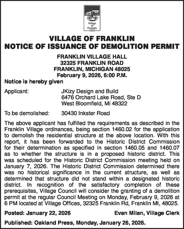 VILLAGE OF FRANKLIN NOTICE OF ISSUANCE OF DEMOLITION PERMIT FRANKLIN VILLAGE HALL 32325 FRANKLIN ROAD FRANKLIN, MICHIGAN 48025 February 9, 2026, 6:00 P.M. Notice is hereby given Applicant: JKizy Design and Build 6476 Orchard Lake Road, Ste D West Bloomfield, Mi 48322 To be demolished: 30430 Inkster Road The above applicant has fulfilled the requirements as described in the Franklin Village ordinances, being section 1460.02 for the application to demolish the residential structure at the above location. With this report, it has been forwarded to the Historic District Commission for their determination as specified in section 1460.05 and 1460.07 as to whether the structure is in a proposed historic district. This was scheduled for the Historic District Commission meeting held on January 7, 2026. The Historic District Commission determined there was no historical significance in the current structure, as well as determined that structure did not stand within a designated historic district. In recognition of the satisfactory completion of these prerequisites, Village Council will consider the granting of a demolition permit at the regular Council Meeting on Monday, February 9, 2026 at 6 PM located at Village Offices, 32325 Franklin Rd, Franklin MI, 48025. Posted: January 22, 2026 Evan Milan, Village Clerk Published: Oakland Press, Monday, January 26, 2026.
