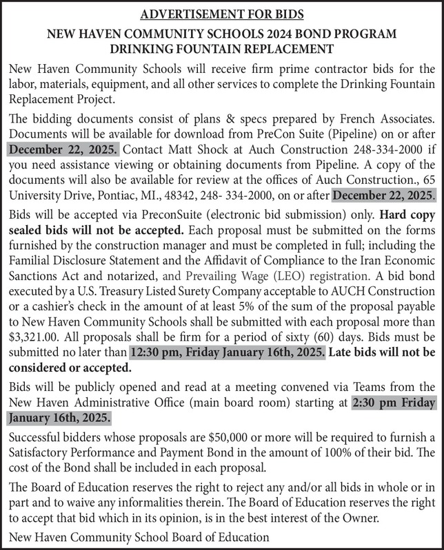 ADVERTISEMENT FOR BIDS NEW HAVEN COMMUNITY SCHOOLS 2024 BOND PROGRAM DRINKING FOUNTAIN REPLACEMENT New Haven Community Schools will receive firm prime contractor bids for the labor, materials, equipment, and all other services to complete the Drinking Fountain Replacement Project. The bidding documents consist of plans & specs prepared by French Associates. Documents will be available for download from PreCon Suite (Pipeline) on or after December 22, 2025. Contact Matt Shock at Auch Construction 248-334-2000 if you need assistance viewing or obtaining documents from Pipeline. A copy of the documents will also be available for review at the offices of Auch Construction., 65 University Drive, Pontiac, MI., 48342, 248- 334-2000, on or after December 22, 2025. Bids will be accepted via PreconSuite (electronic bid submission) only. Hard copy sealed bids will not be accepted. Each proposal must be submitted on the forms furnished by the construction manager and must be completed in full; including the Familial Disclosure Statement and the Affidavit of Compliance to the Iran Economic Sanctions Act and notarized, and Prevailing Wage (LEO) registration. A bid bond executed by a U.S. Treasury Listed Surety Company acceptable to AUCH Construction or a cashier’s check in the amount of at least 5% of the sum of the proposal payable to New Haven Community Schools shall be submitted with each proposal more than $3,321.00. All proposals shall be firm for a period of sixty (60) days. Bids must be submitted no later than 12:30 pm, Friday January 16th, 2025. Late bids will not be considered or accepted. Bids will be publicly opened and read at a meeting convened via Teams from the New Haven Administrative Office (main board room) starting at 2:30 pm Friday January 16th, 2025. Successful bidders whose proposals are $50,000 or more will be required to furnish a Satisfactory Performance and Payment Bond in the amount of 100% of their bid. The cost of the Bond shall be included in each proposal. The Board of Education reserves the right to reject any and/or all bids in whole or in part and to waive any informalities therein. The Board of Education reserves the right to accept that bid which in its opinion, is in the best interest of the Owner. New Haven Community School Board of Education
