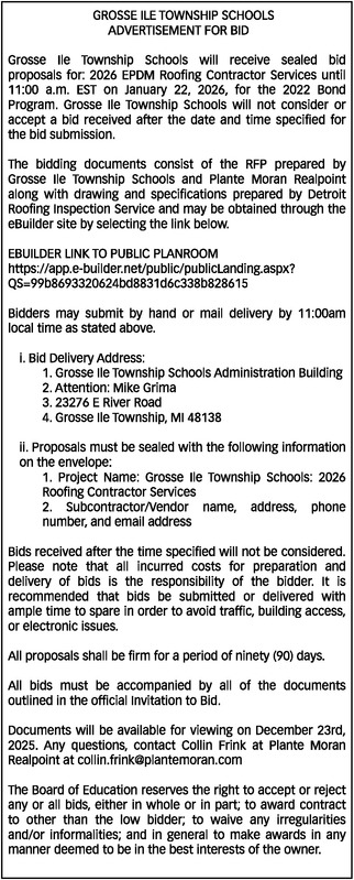 GROSSE ILE TOWNSHIP SCHOOLS ADVERTISEMENT FOR BID Grosse Ile Township Schools will receive sealed bid proposals for: 2026 EPDM Roofing Contractor Services until 11:00 a.m. EST on January 22, 2026, for the 2022 Bond Program. Grosse Ile Township Schools will not consider or accept a bid received after the date and time specified for the bid submission. The bidding documents consist of the RFP prepared by Grosse Ile Township Schools and Plante Moran Realpoint along with drawing and specifications prepared by Detroit Roofing Inspection Service and may be obtained through the eBuilder site by selecting the link below. EBUILDER LINK TO PUBLIC PLANROOM https://app.e-builder.net/public/publicLanding.aspx?QS=99b8693320624bd8831d6c338b828615 Bidders may submit by hand or mail delivery by 11:00am local time as stated above. i. Bid Delivery Address: 1. Grosse Ile Township Schools Administration Building 2. Attention: Mike Grima 3. 23276 E River Road 4. Grosse Ile Township, MI 48138 ii. Proposals must be sealed with the following information on the envelope: 1. Project Name: Grosse Ile Township Schools: 2026 Roofing Contractor Services 2. Subcontractor/Vendor name, address, phone number, and email address Bids received after the time specified will not be considered. Please note that all incurred costs for preparation and delivery of bids is the responsibility of the bidder. It is recommended that bids be submitted or delivered with ample time to spare in order to avoid traffic, building access, or electronic issues. All proposals shall be firm for a period of ninety (90) days. All bids must be accompanied by all of the documents outlined in the official Invitation to Bid. Documents will be available for viewing on December 23rd, 2025. Any questions, contact Collin Frink at Plante Moran Realpoint at collin.frink@plantemoran.com The Board of Education reserves the right to accept or reject any or all bids, either in whole or in part; to award contract to other than the low bidder; to waive any irregularities and/or informalities; and in general to make awards in any manner deemed to be in the best interests of the owner.